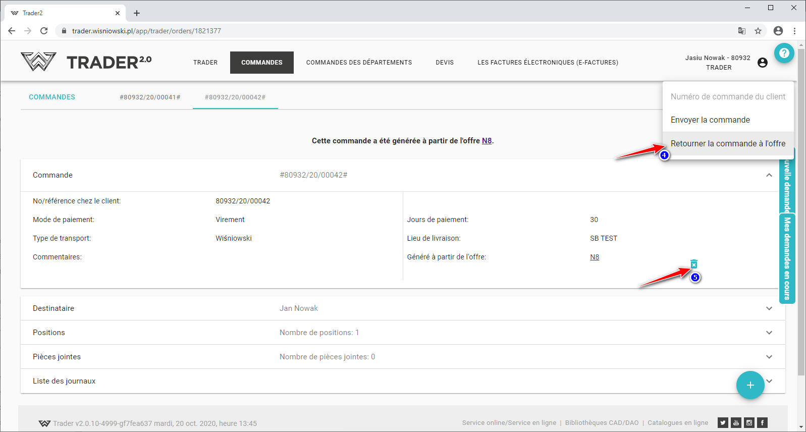 De même, en allant à la commande générée, vous avez la possibilité de Retourner la commande à l'offre/au devis (4) (dans le coin supérieur droit en cliquant sur ) ou dans la section "Commande" il y a une icône (5).