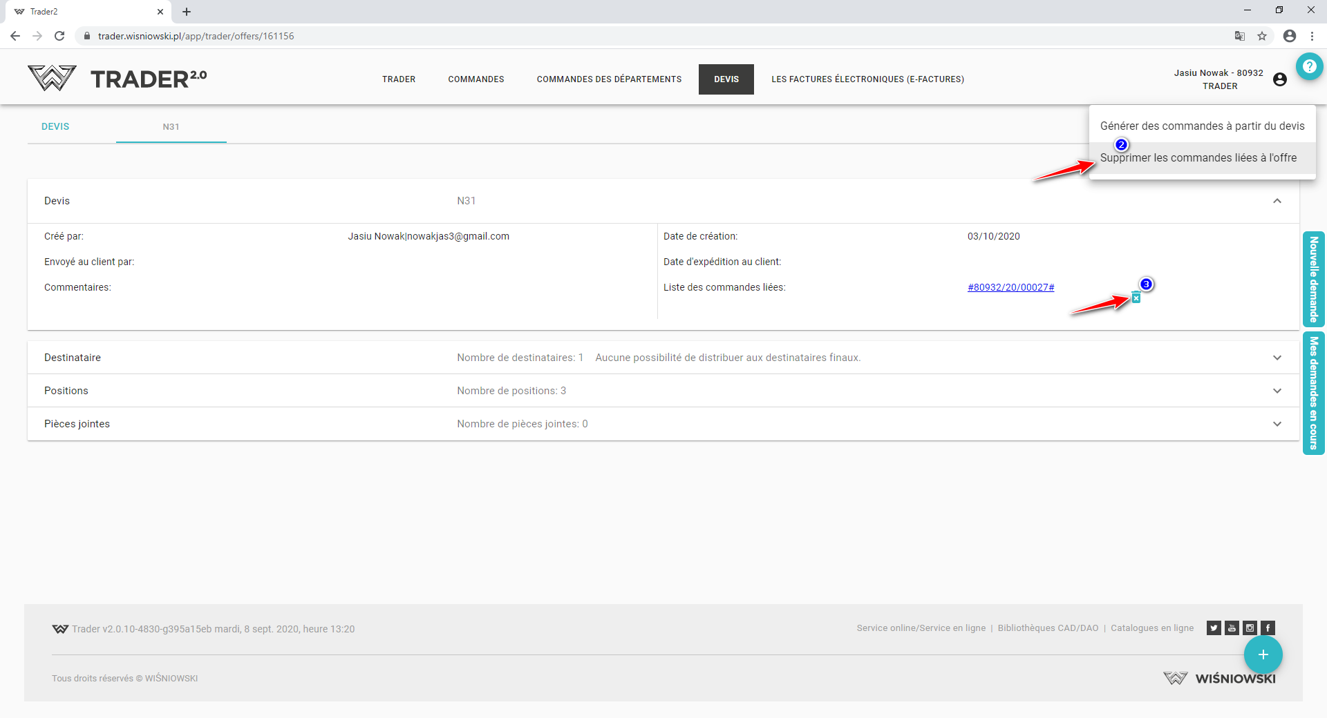 Vous pouvez également supprimer les commandes liées au devis en cliquant sur l'icône de changement de statut dans le coin supérieur droit disponibles est l'option Supprimer les commandes liées au devis/à l'offre (2) ou dans l'onglet "Devis" il y a une icône (3).