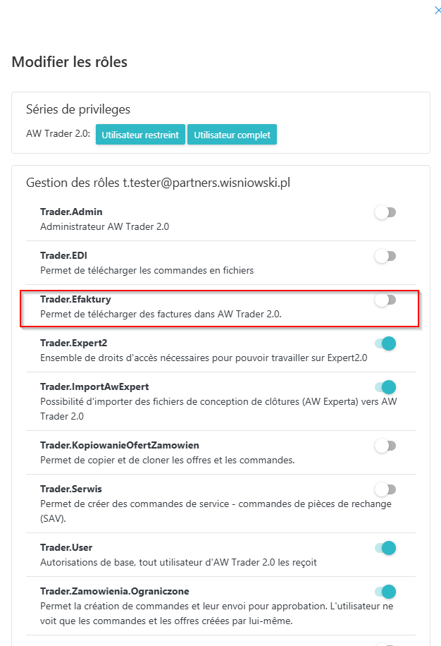 L'accès à cet onglet est limité. Si vous disposez de droits d'administrateur pour gérer votre entreprise, vous pouvez attribuer le rôle Trader.Efaktury aux personnes choisies dans le panneau d'administration.