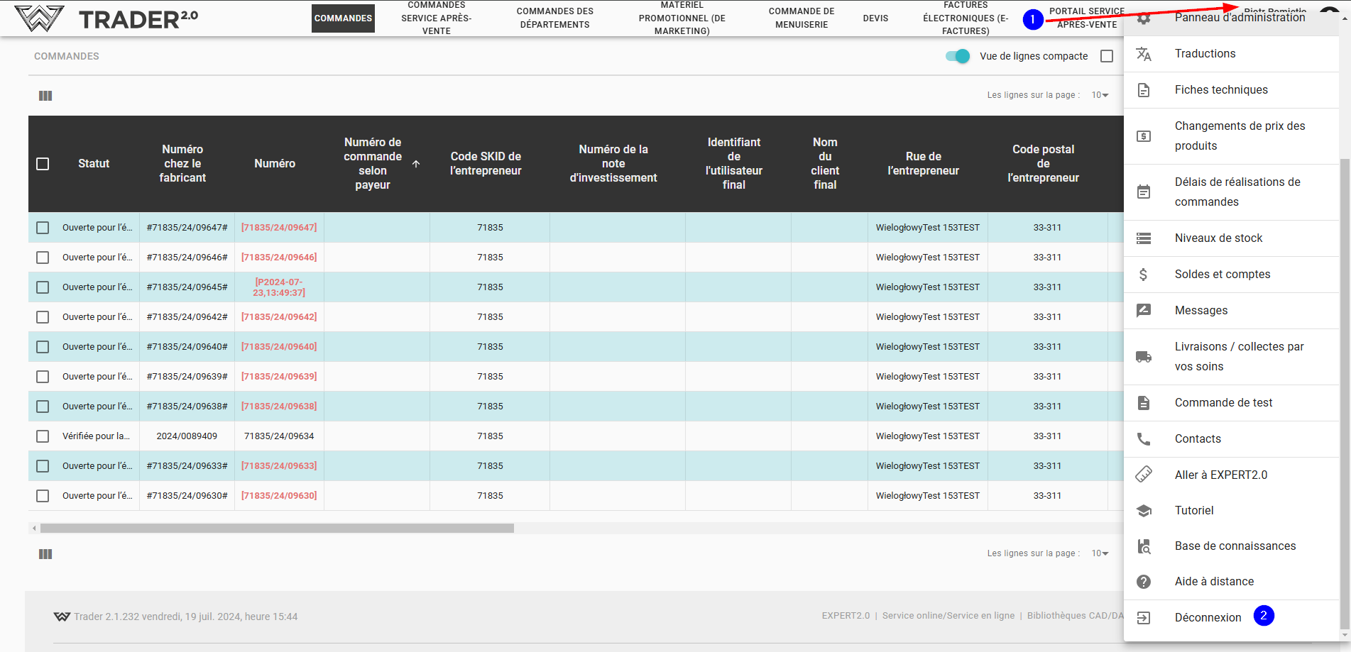 Pour vous déconnecter de l'application, cliquez sur votre nom d'utilisateur (1) puis sélectionnez Déconnexion (2).