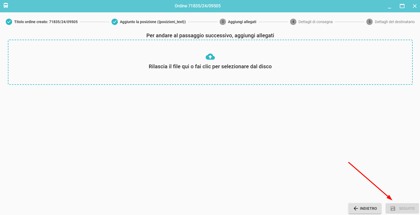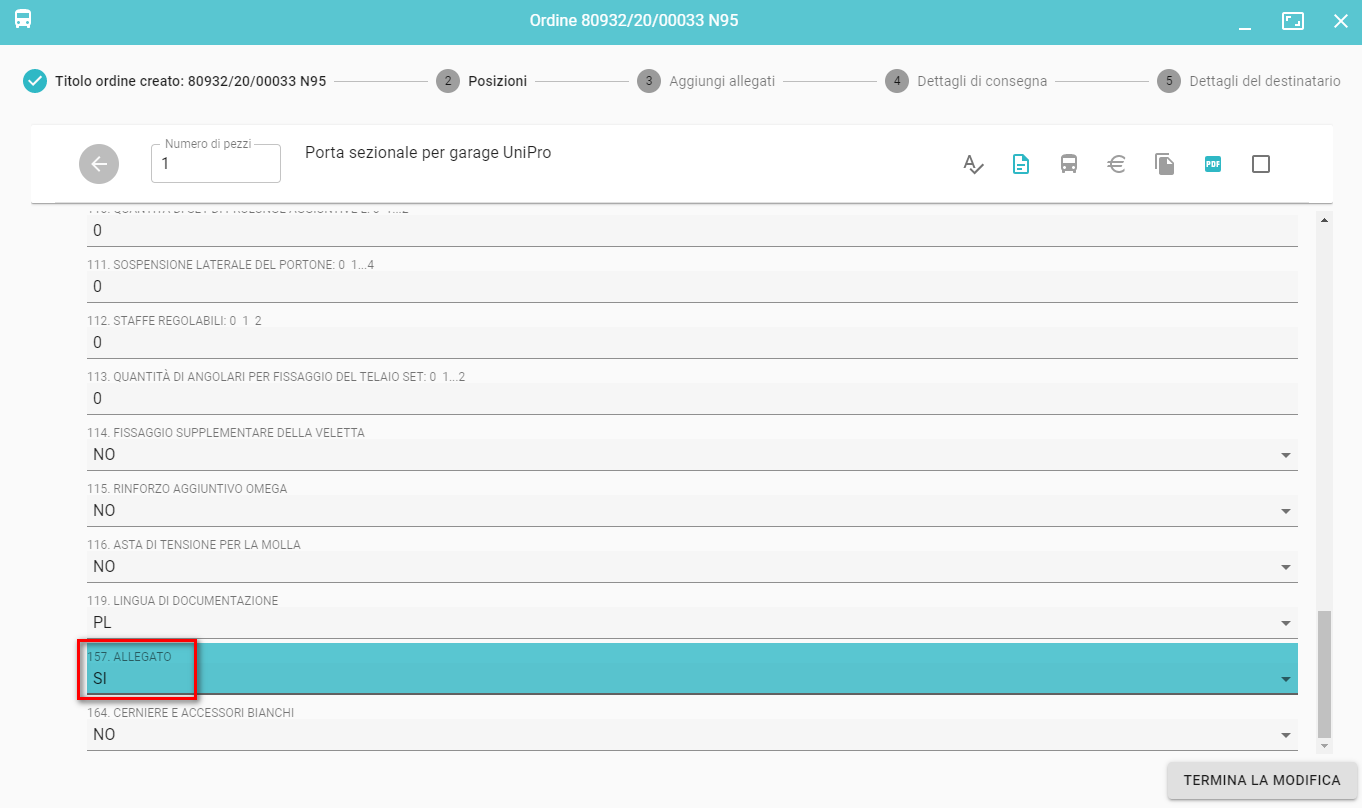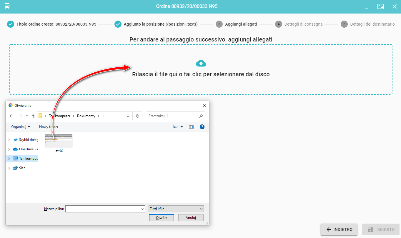 Per ogni ordine è possibile aggiungere un allegato. Se nella proprietà del prodotto l'opzione ALLEGARE FILE è impostata su SÌ, l'aggiunta di un allegato è obbligatoria e non è possibile saltare questo passaggio durante l'inserimento dell'ordine.