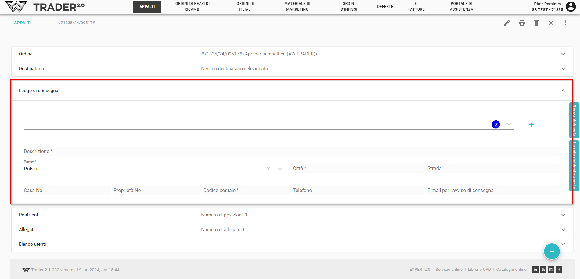 Luogo di consegna (per tutte le posizioni dell'ordine) - compiliamo se il luogo di consegna è diverso dal magazzino di consegna nell'intestazione dell'ordine.