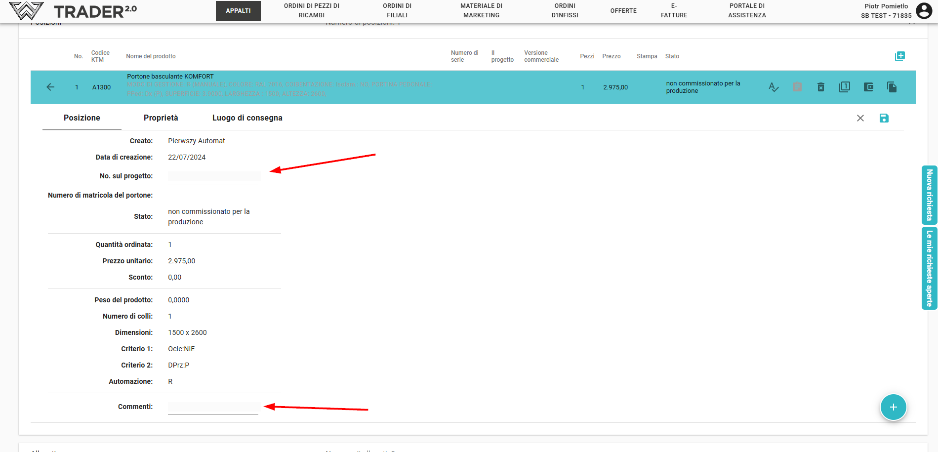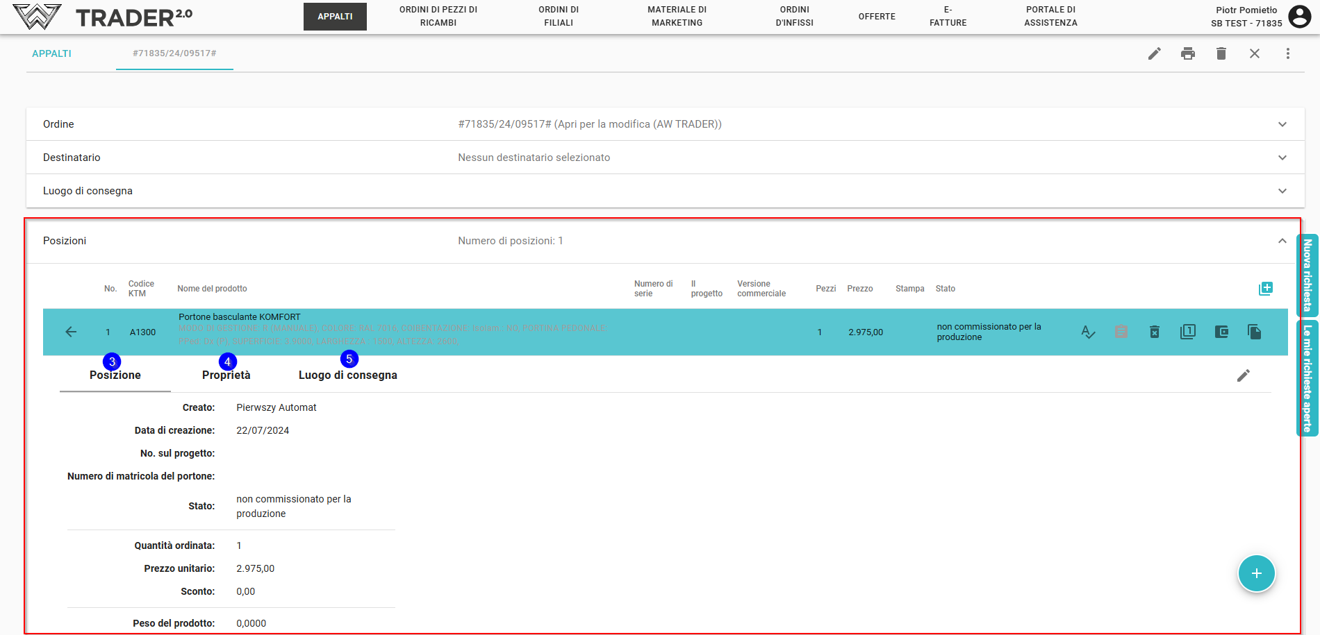 Posizioni: elenco dei prodotti aggiunti, cliccando su un prodotto specifico, si aprirà la possibilità di modificare la posizione (3), proprietà (4), luogo di consegna (5)