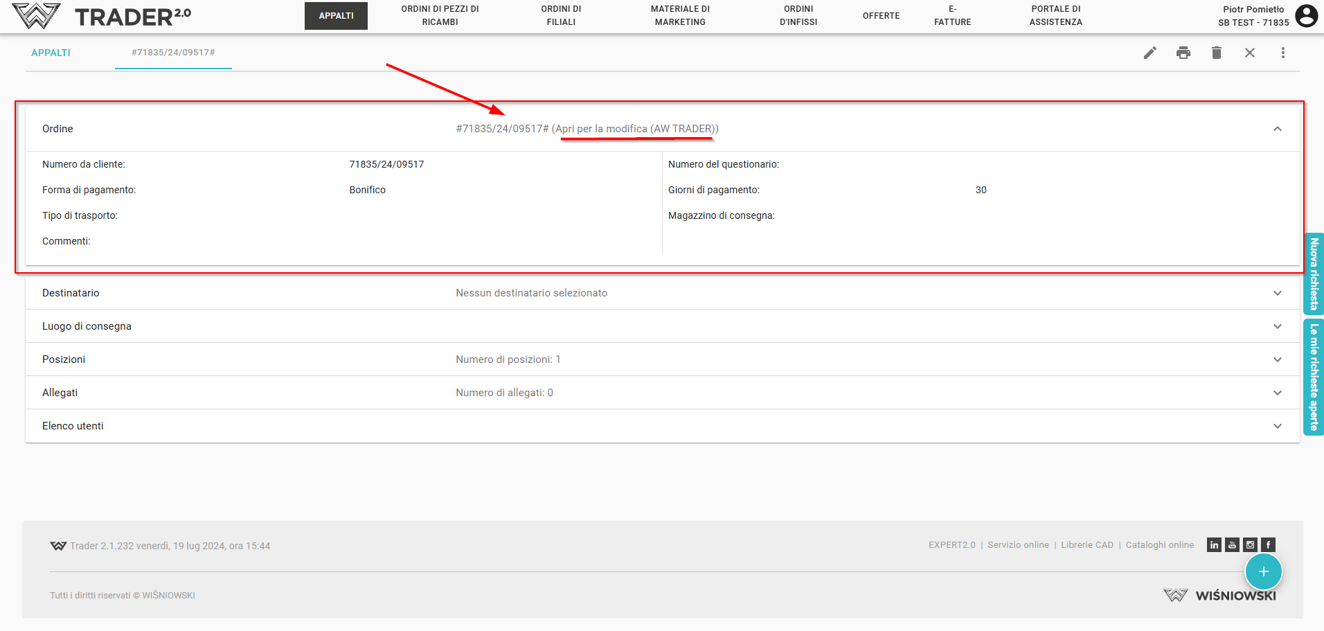 Ordine: qui troverai le informazioni di base, come il numero dell'ordine con lo stato (es. "Aperto per modifica'"), numero del cliente, modalità di pagamento, tipo di trasporto, note, numero del questionario, giorni di pagamento e magazzino di consegna - necessario per la spedizione dell'ordine.