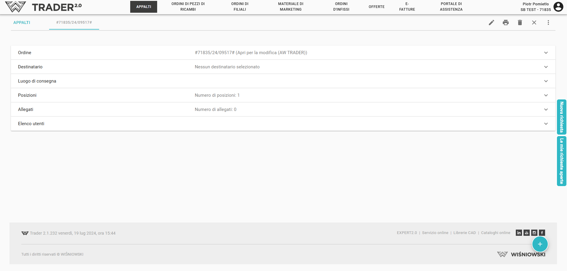 Dopo aver aperto l'ordine ricercato, vengono visualizzate le singole sezioni: