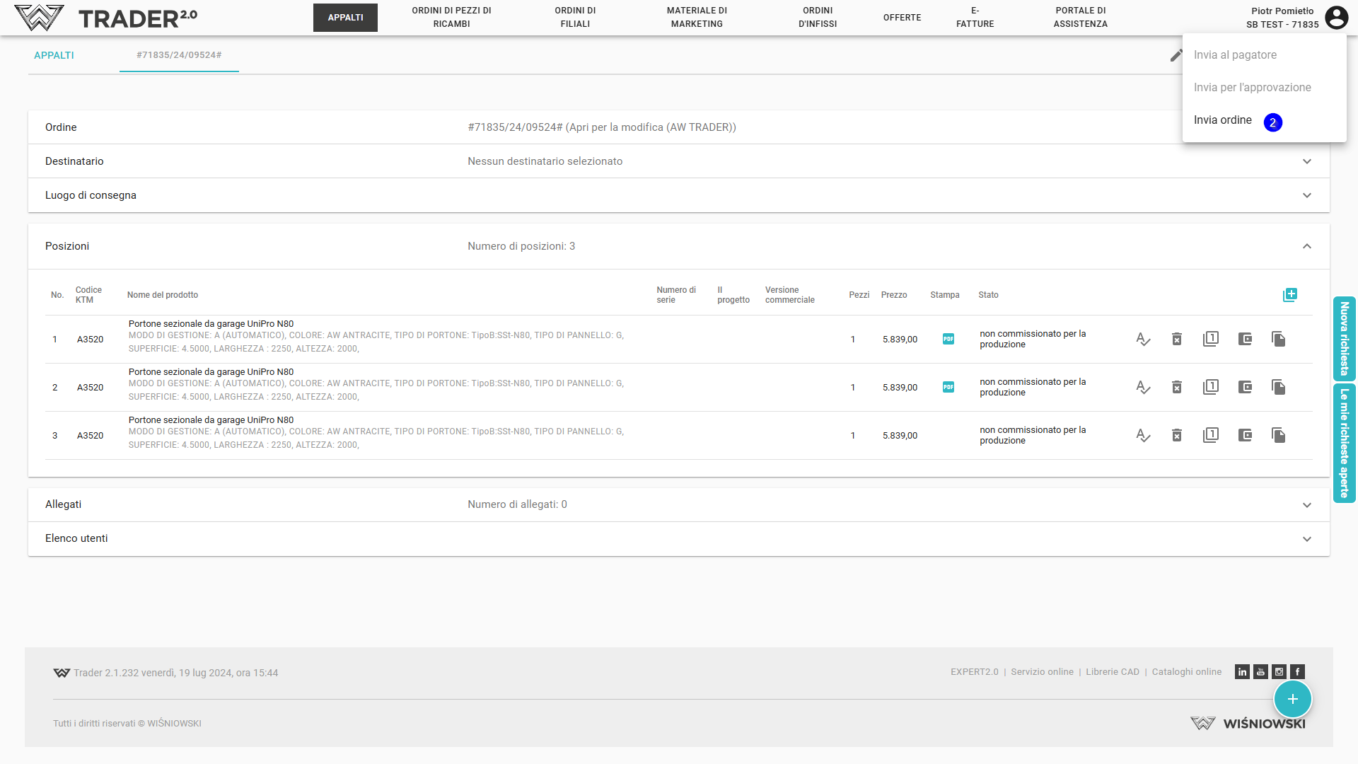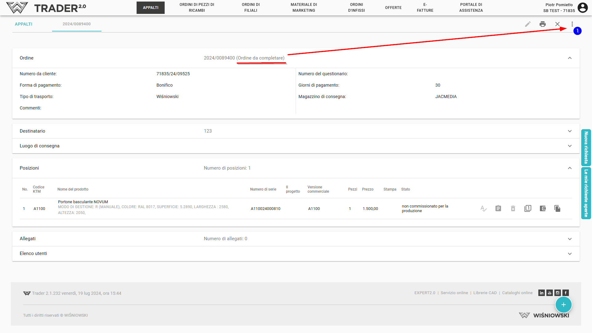Per inviare un ordine, apri l'ordine e nell'angolo in alto a destra fai clic sull'icona di modifica dello stato (1).