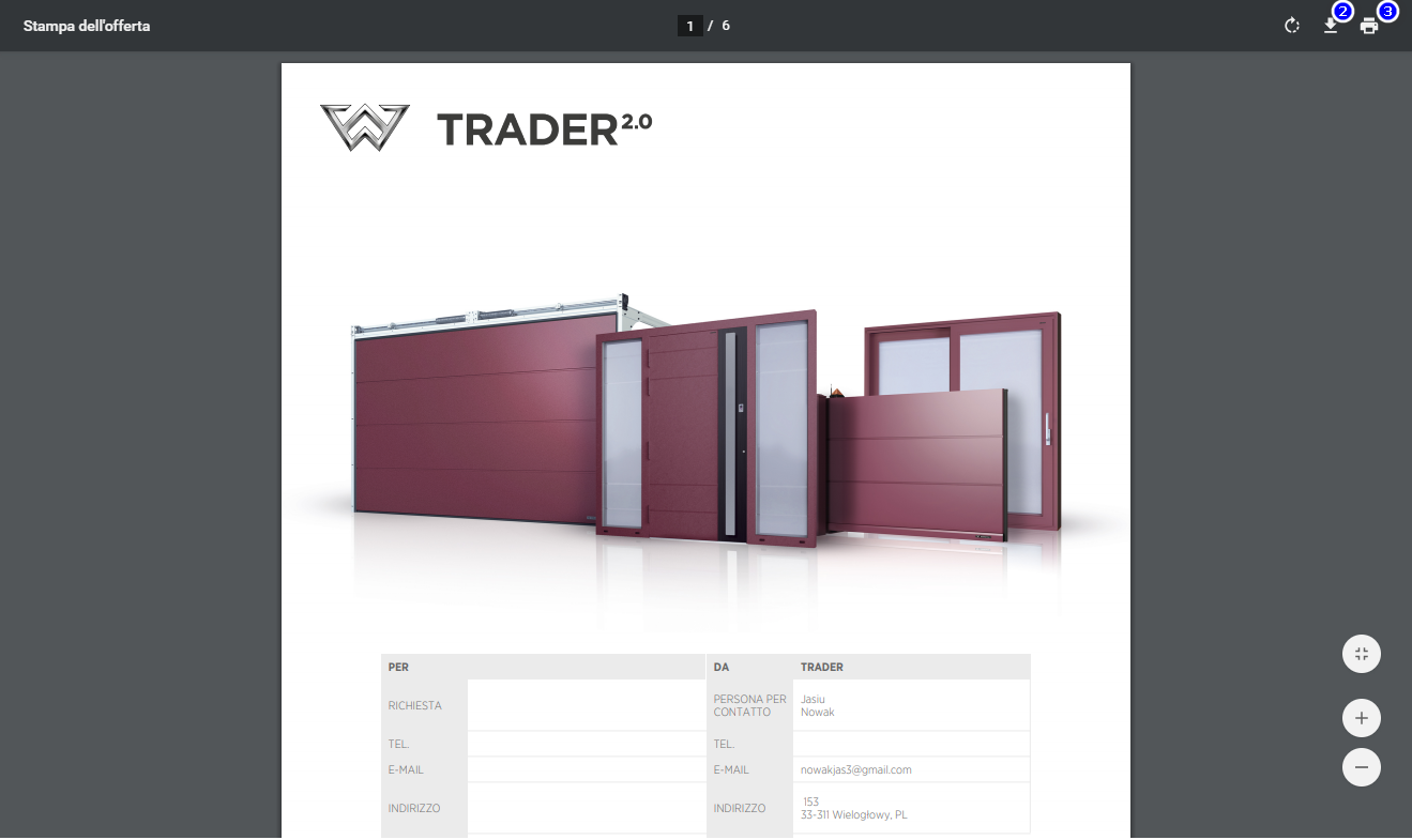 L'offerta si apre come file PDF, che può essere scaricato e salvato su disco (2) o stampato, se necessario (3).