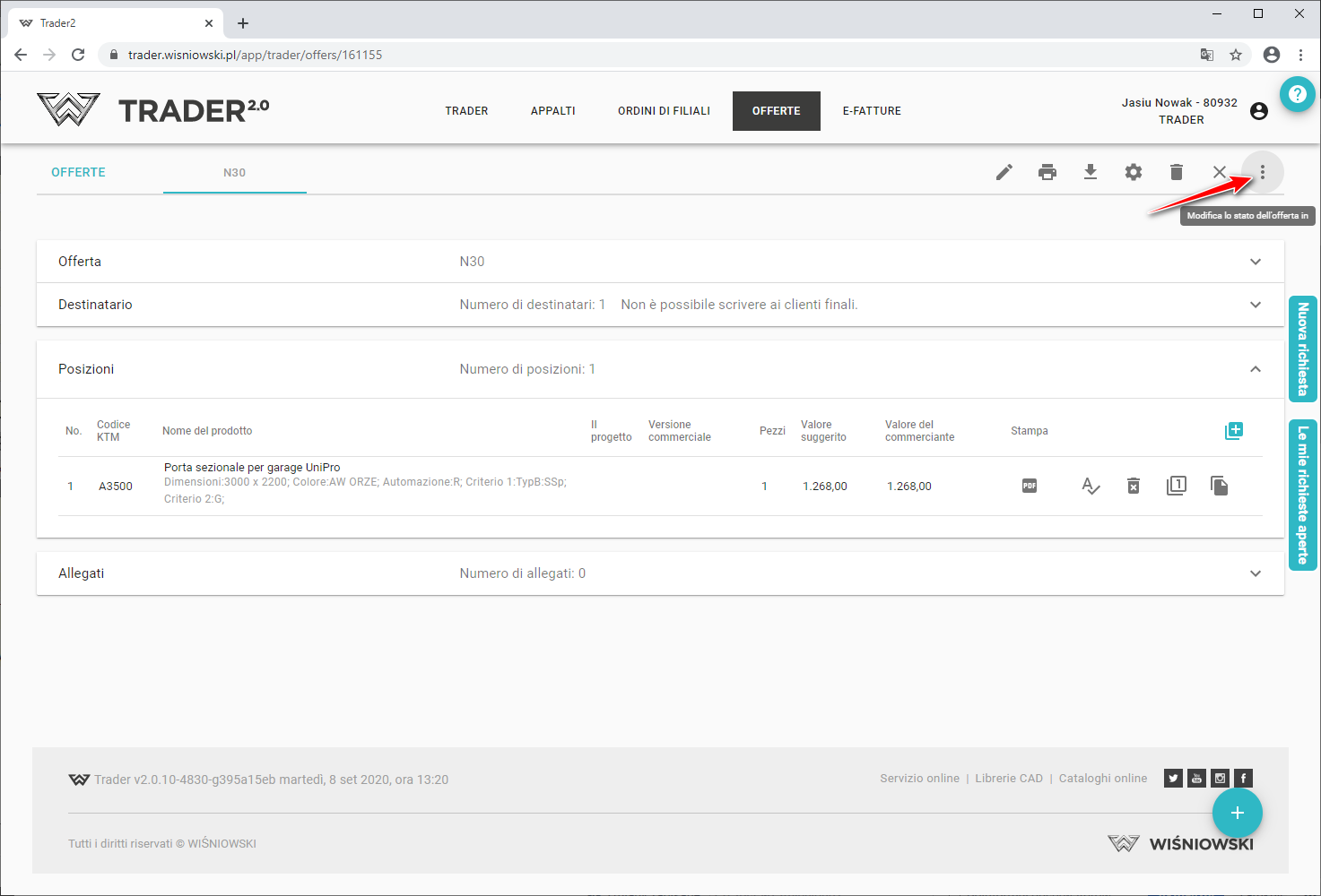 Per generare un ordine da un'offerta, aprire l'offerta inserita e, nell'angolo in alto a destra, fare clic sull'icona di modifica dello stato.