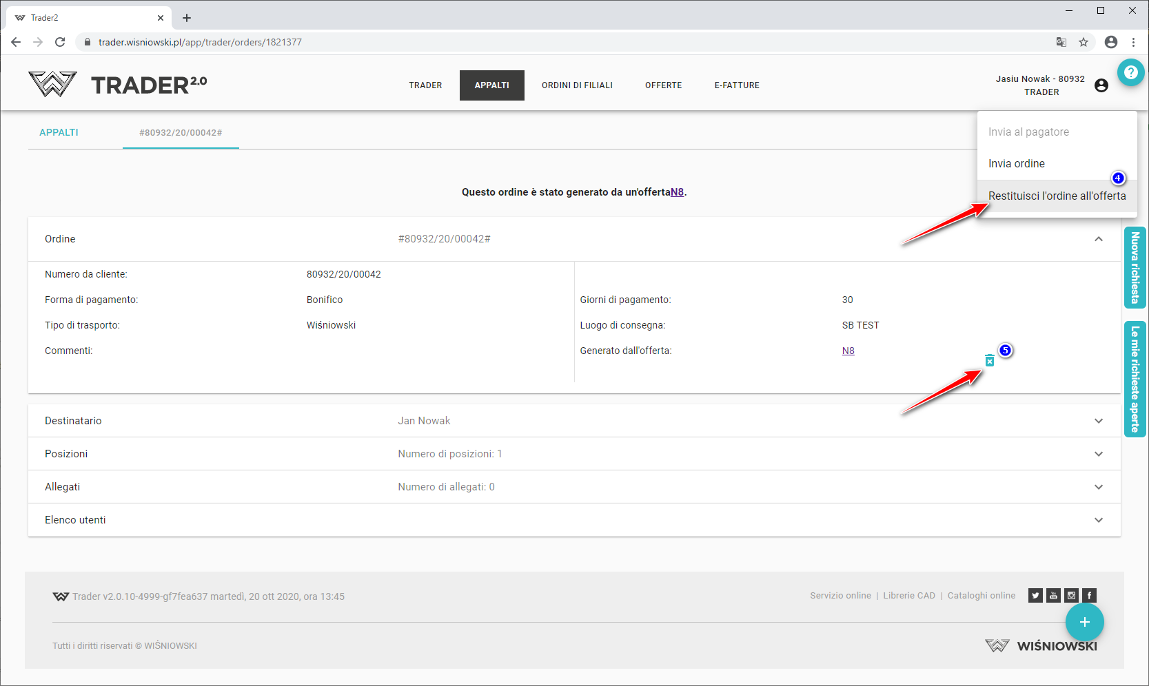 La seconda opzione è quella di andare all'ordine selezionato e dal menu di azione, richiamato dall'icona , utilizzare l'opzione Restituisci l'ordine all'offerta (4) oppure dalla sezione “Ordine” cliccare sull'icona disponibile (5).