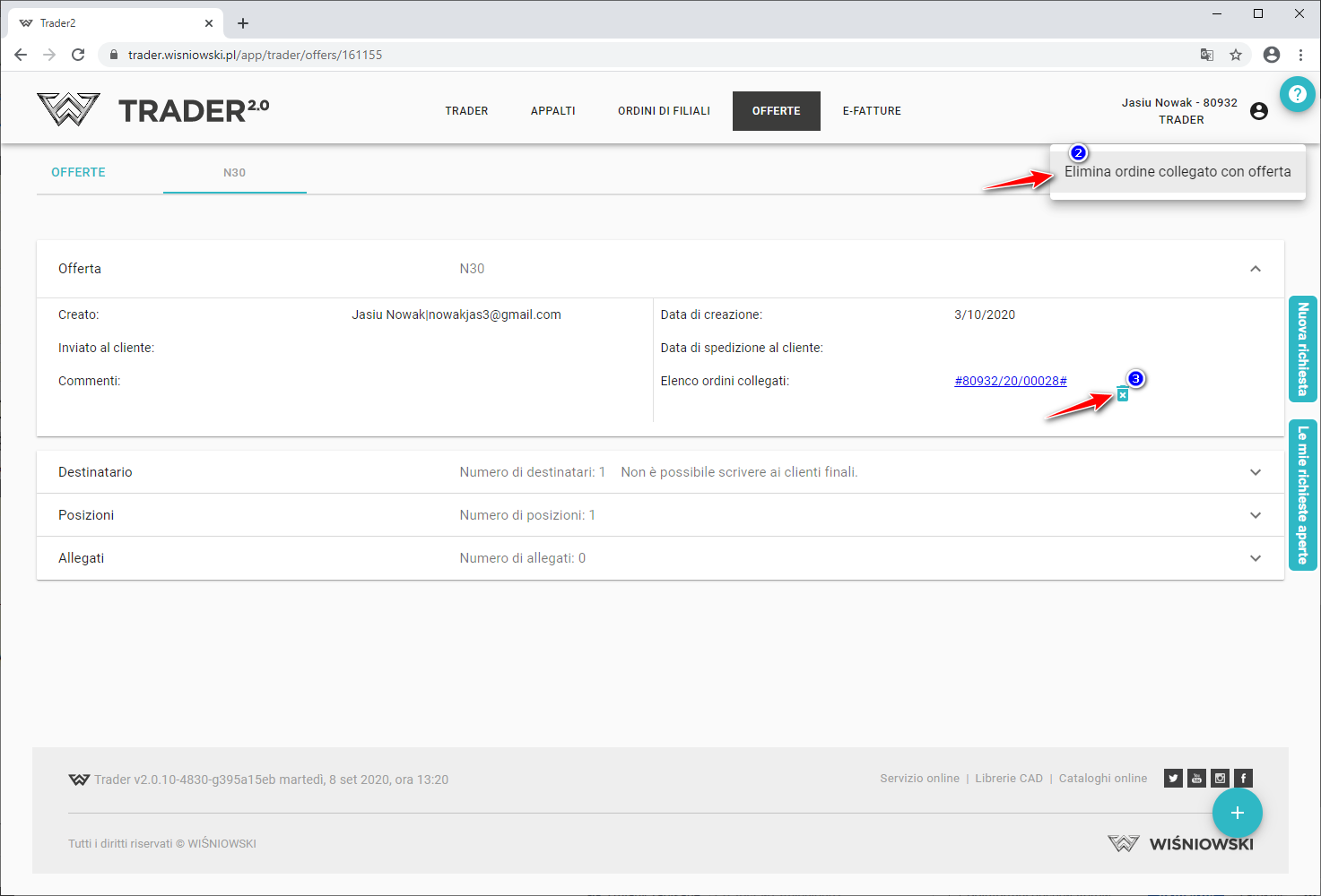 Nell'ordine generato dall'offerta, la modifica delle posizioni è bloccata. L'eliminazione/annullamento degli ordini correlati all'offerta ti consentirà di modificare nuovamente le voci se desideri apportare modifiche. Puoi farlo eliminando gli ordini correlati all'offerta. Mentre sei nell'offerta selezionata, fai clic sull'icona di modifica dello stato nell'angolo in alto a destra , e poi l'opzione Elimina ordine collegato con offerta (2) oppure cliccando sull'icona nella sezione 'Offerta' (3).