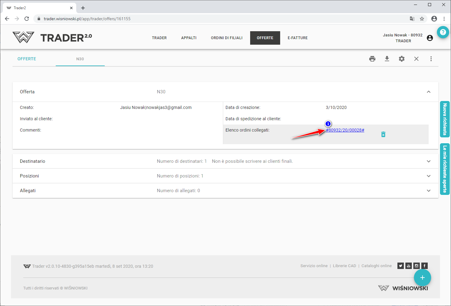 Nei dettagli dell'offerta apparirà un elenco degli ordini correlati, e cliccando sul numero (1) verrai automaticamente reindirizzato all'ordine creato. (L'ordine generato può anche essere trovato nella scheda ORDINI nell'elenco degli ordini).