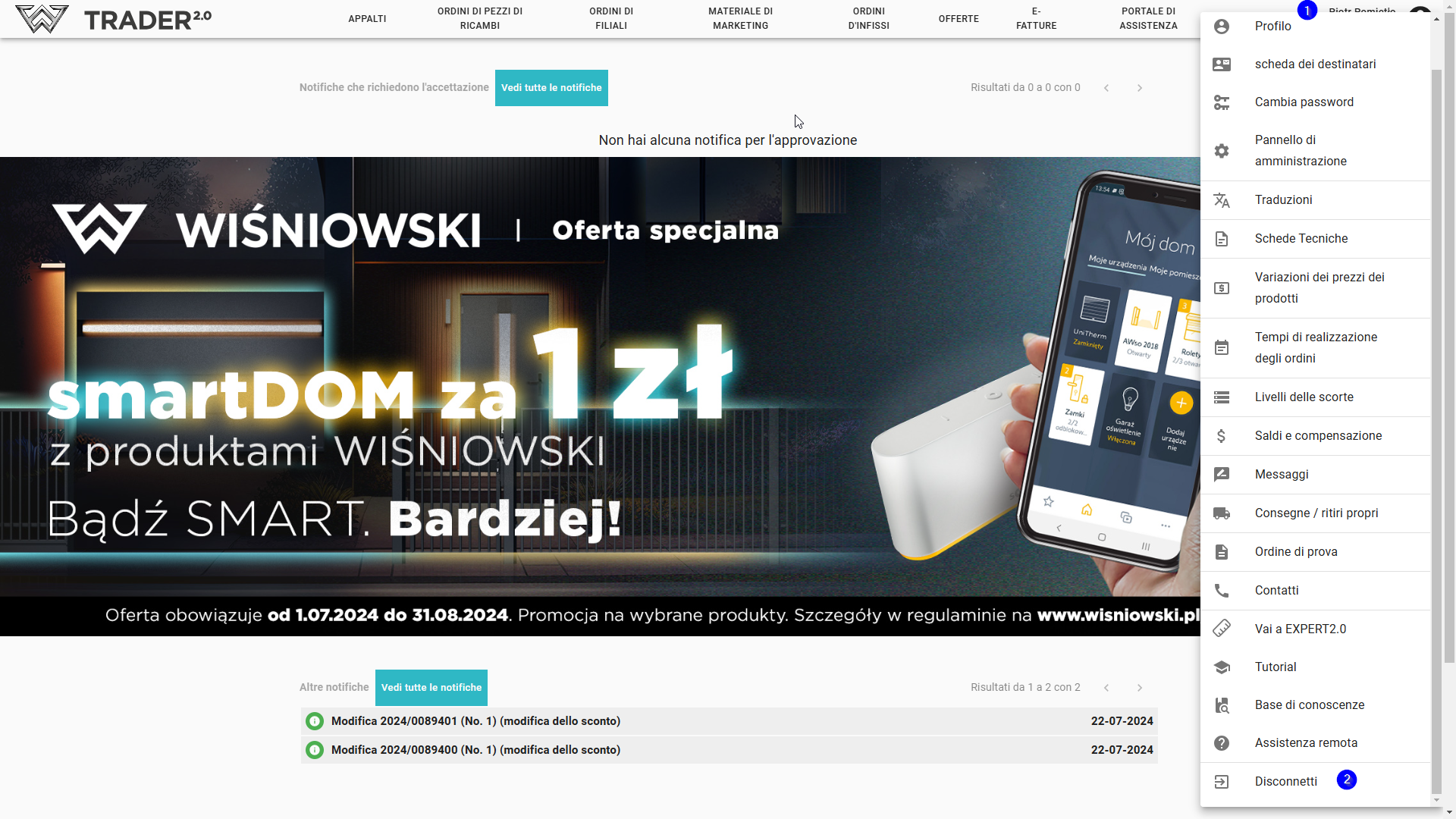 Per uscire dall'applicazione, cliccare sul proprio nome utente (1) e poi selezionare Disconnetti (2).