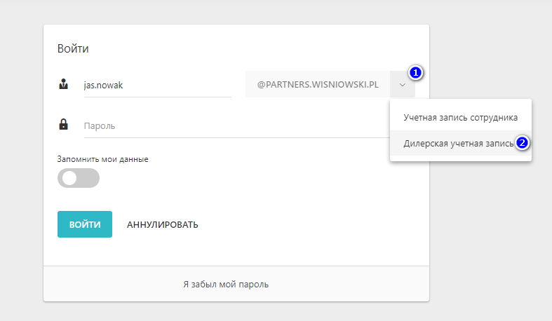 Чтобы войти в приложение зайдите на сайт https://trader.wisniowski.pl. В списке выбора (1) являетесь ли вы сотрудником или дилером - выбрав Дилерскую учетную запись (2)