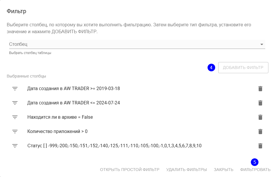 Чтобы запустить фильтр, нажмите Добавить Фильтр (4) а затем Фильтровать (5).