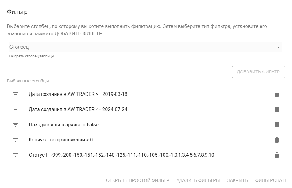 Чтобы удалить фильтр, нажмите Удалить Фильтры (6) или нажмите на значок (7)