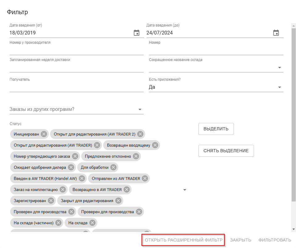 - статусу заказа (возможность Выделить / Снять выделение всех статусов или выбор из списка)