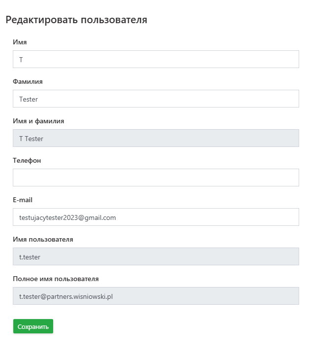 Чтобы редактировать некоторые данные пользователей, нажмите на значок и исправьте выбранные данные. Можно редактировать следующие данные: Имя, Фамилия, Отображаемое название, Адрес электронной почты и Язык приложения.