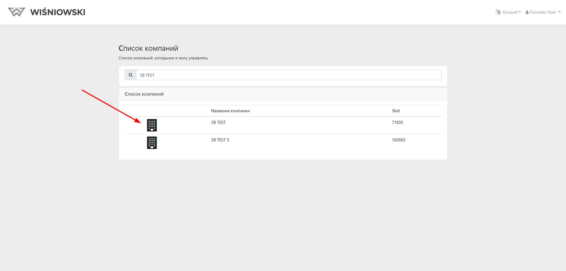 После перехода в панель администратора появится список компаний. Вам следует выбрать компанию, в рамках которой Вы будете управлять пользователями и их ролями.