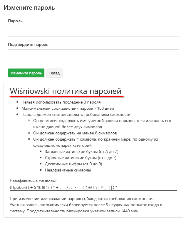 Чтобы изменить пароль выбранного пользователя, нажмите на значок и введите новый пароль в соответствии с политикой безопасности, описанной в окне изменения пароля.