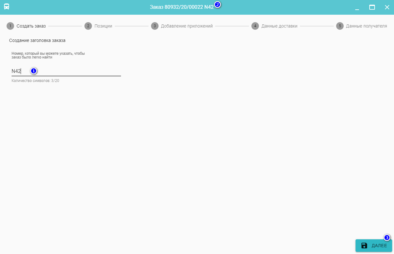 Заголовок заказа - на этом этапе введите свой номер заказа (1), который в дальнейшем также будет отображаться в верхней строке заголовка (2) - после этого нажмите Далее (3)