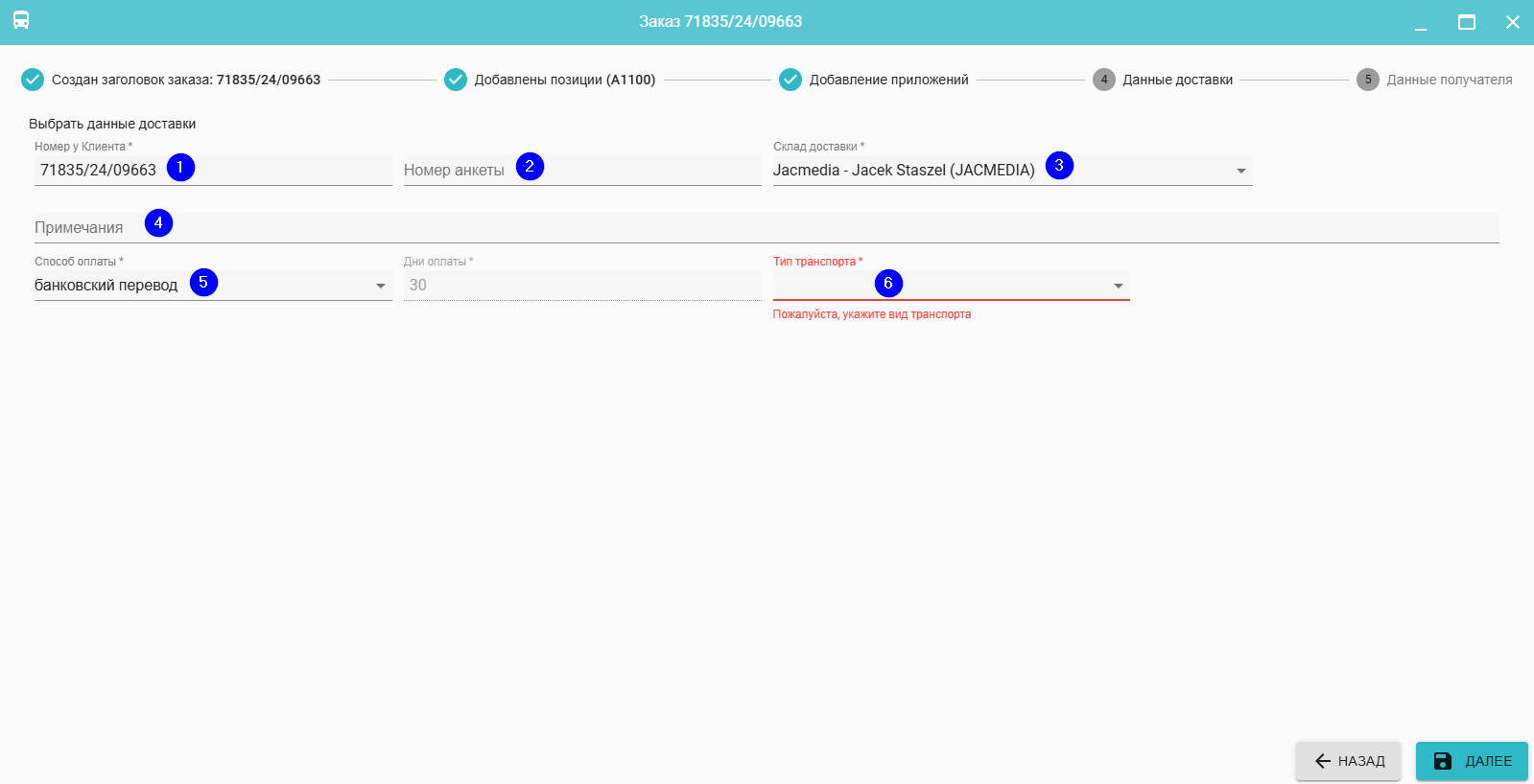 После ввода данных доставки нажмите на кнопку Далее (7)