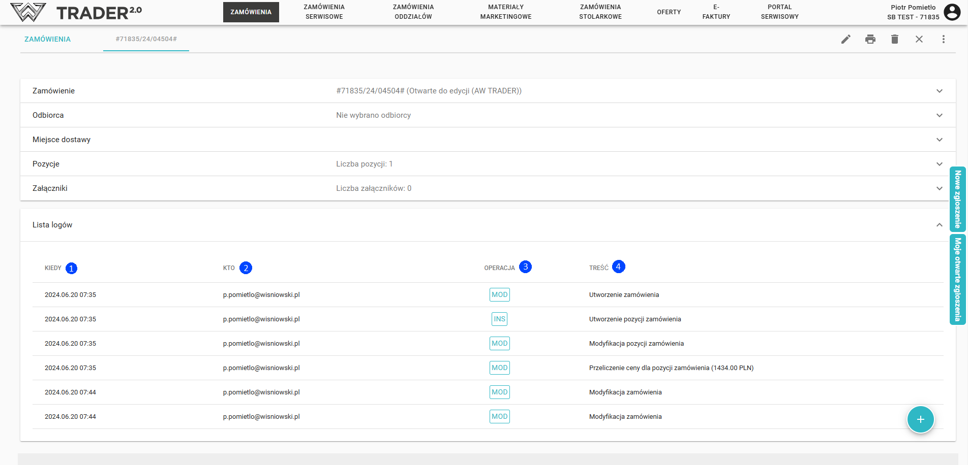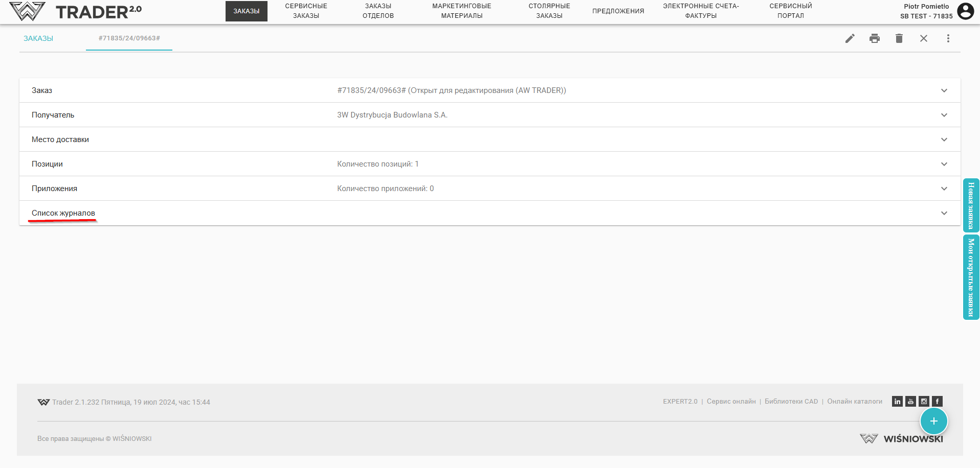 Для каждого заказа можно проверить его историю изменений. Для этого после открытия заказа следует перейти на вкладку Список журналов
