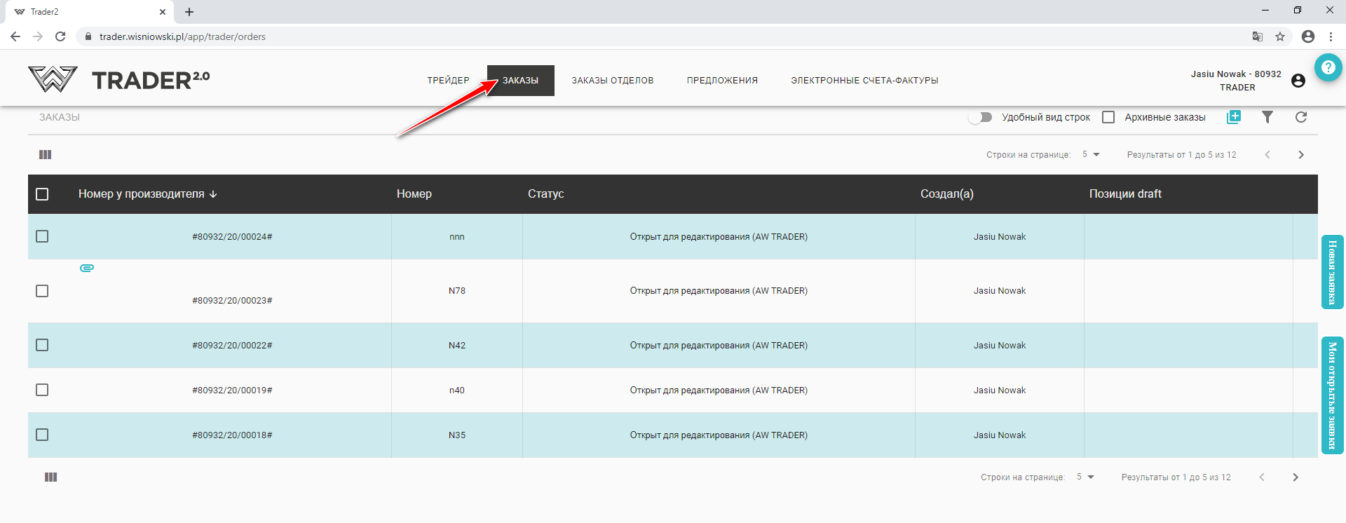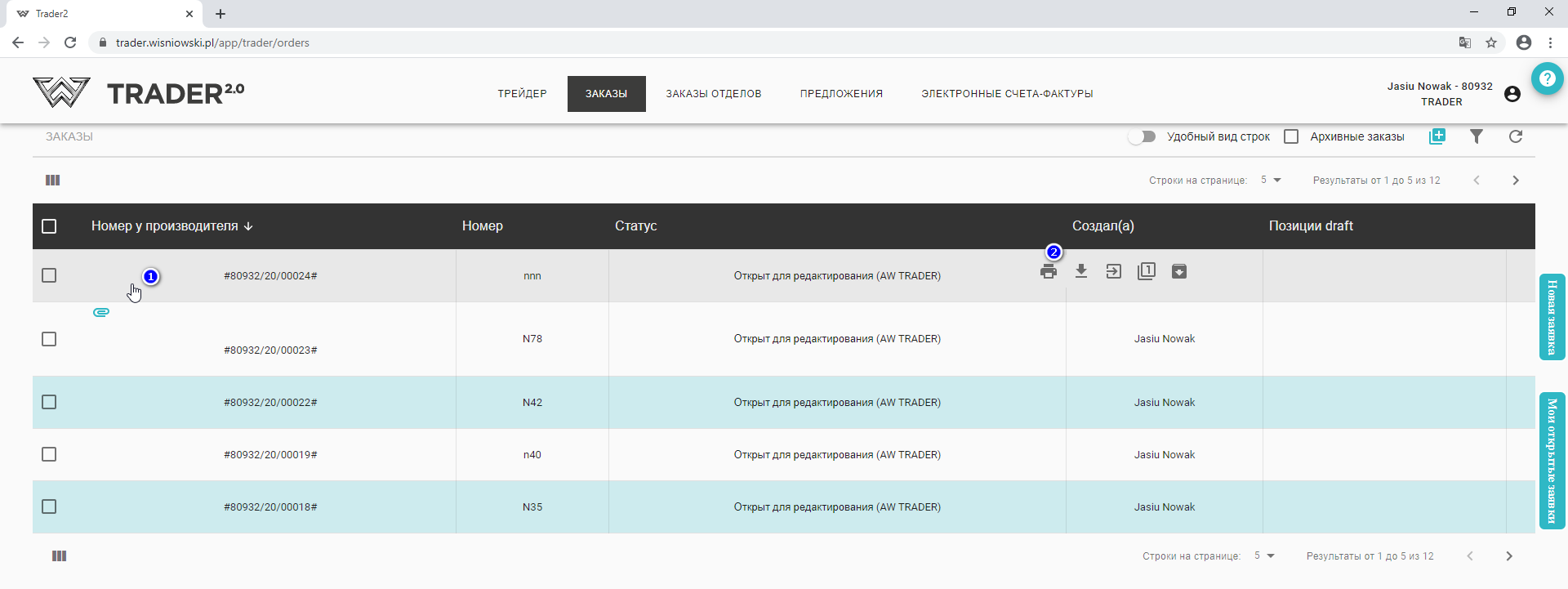 Наведите курсор мыши на заказ, который Вы хотите распечатать (1). Появится, в том числе, значок (2).