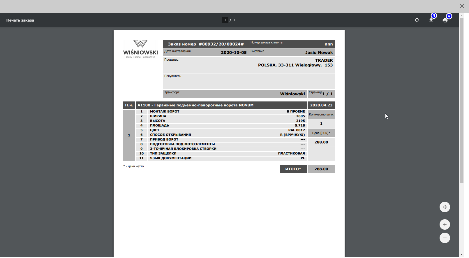 Нажмите на него, чтобы сформировать распечатку заказа в формате PDF. Созданный файл можно загрузить (3) и сохранить на диск компьютера или распечатать (4).