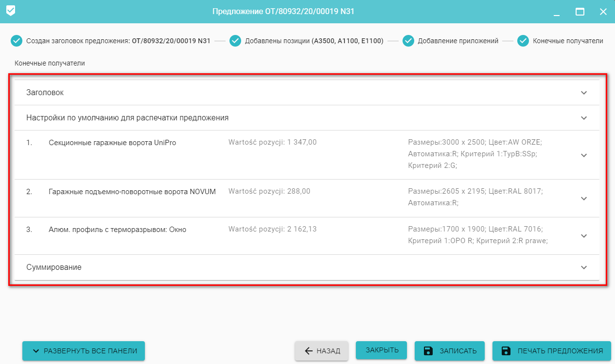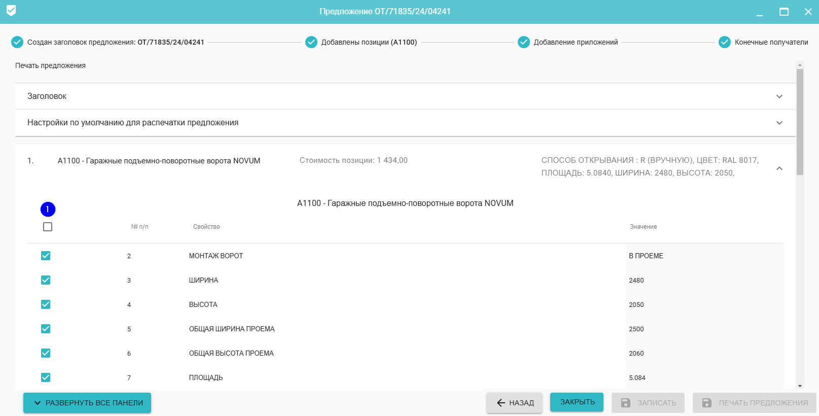Настройка данных для печати предложения состоит из следующих элементов: