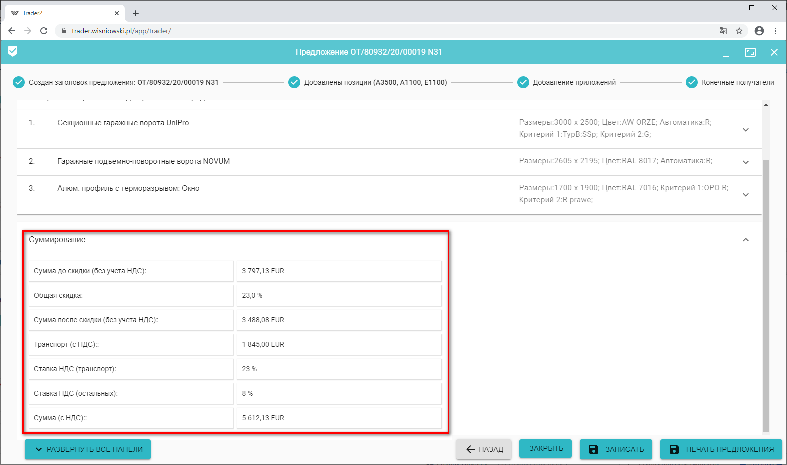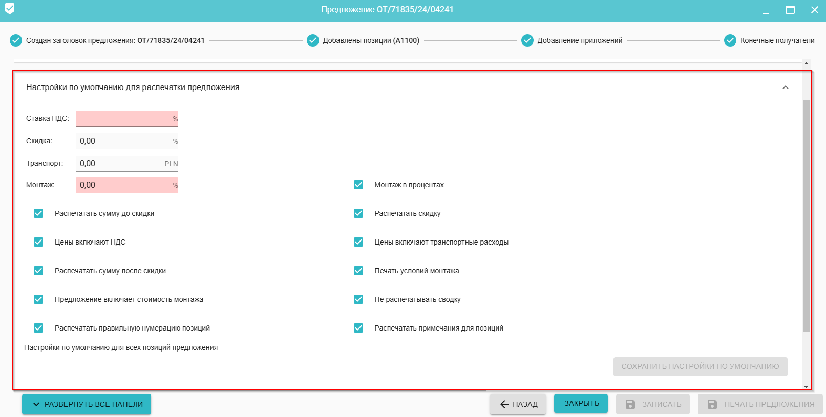 3. Настройки по умолчанию для печати предложения.