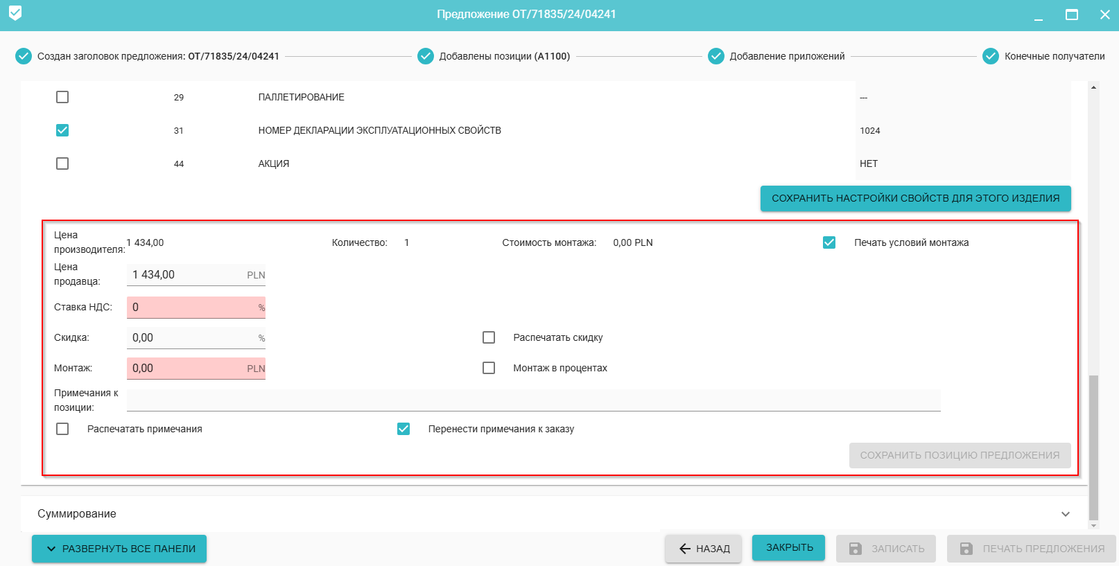 5. Настройка информации о ценах, ставках НДС, скидках, монтаже, примечания для выбранной позиции предложения вместе с информацией о том, должно ли оно появиться на распечатке предложения, как отдельный элемент сводки, а также информация о том, должны ли печататься условия монтажа для данной позиции (если имеются). Кроме того, Вы можете указать, нужно ли переносить комментарии по позиции в заказ.