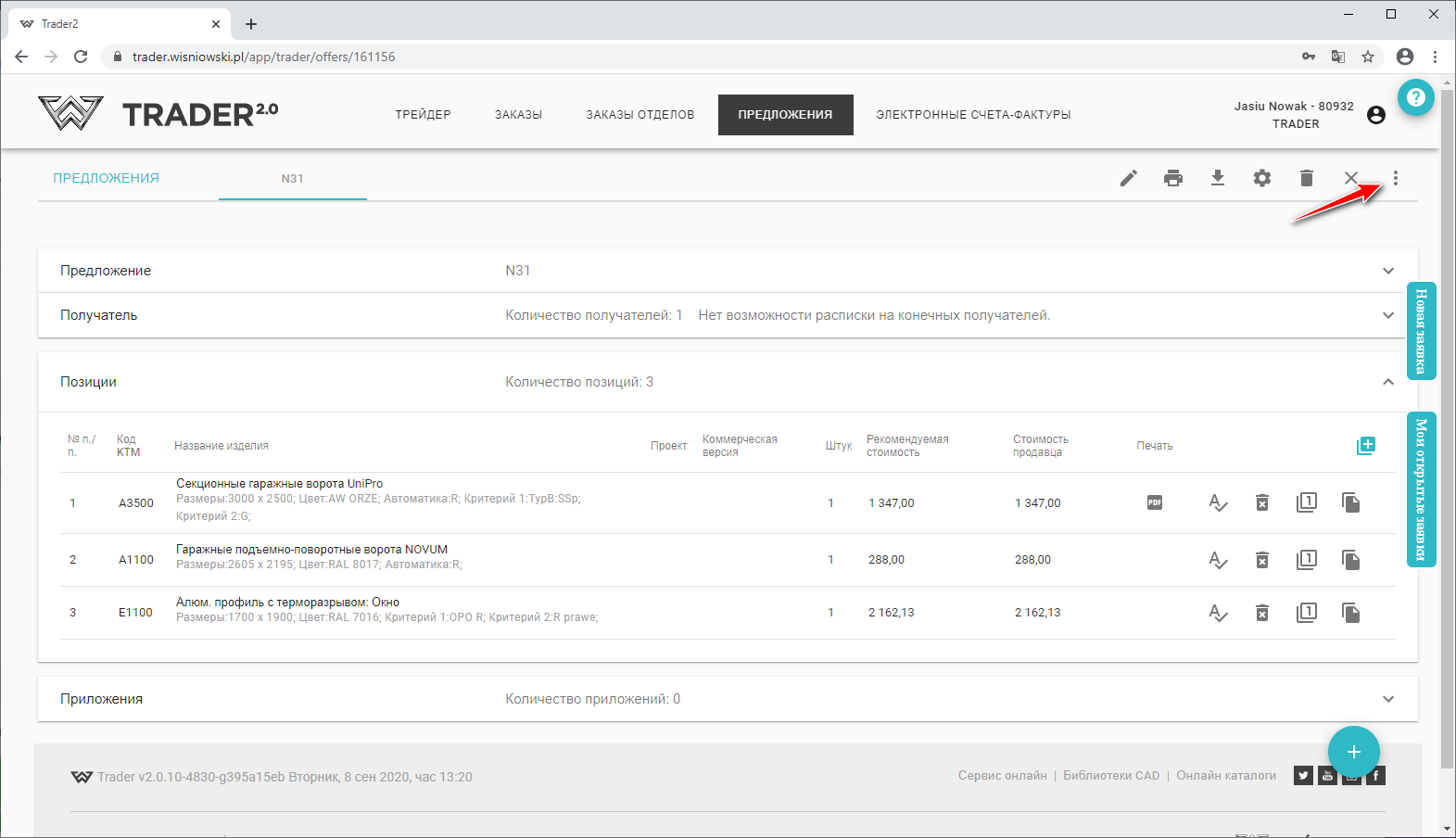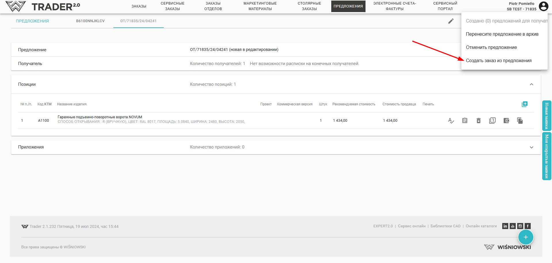 Опция Создать заказ из предложения будет возможна только в том случае, если добавлен Получатель и предложение имеет хотя бы одну добавленную позицию (позиция не может иметь статуса ЧЕРНОВИК ).