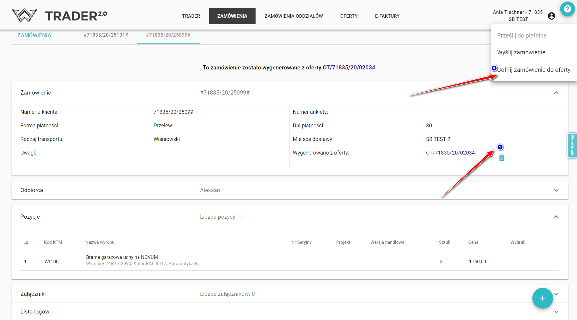 Второй вариант - перейти к выбранному заказу и из меню действий, вызываемого значкомą , Вы можете воспользоваться опцией Отменить заказ для предложения (4) или в разделе 'Заказ' использовать значок (5).