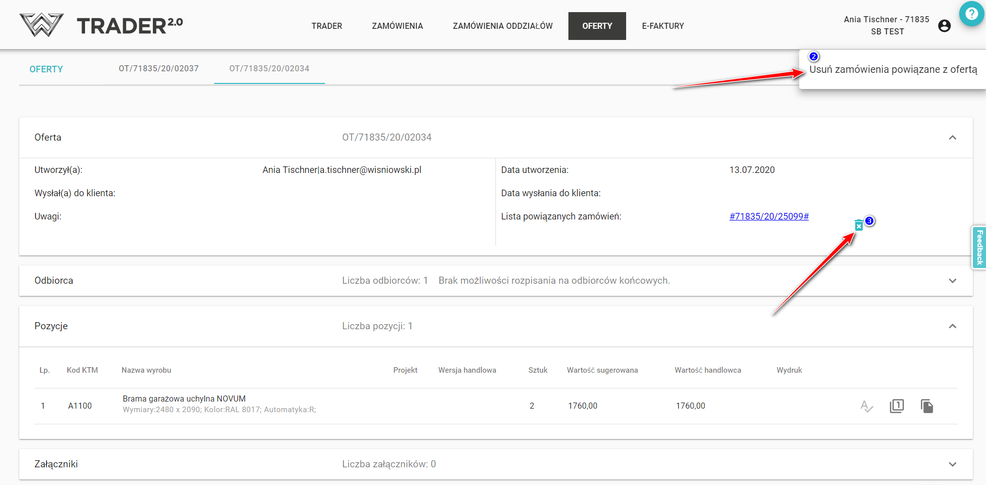 Вы можете сделать это, удалив заказы, связанные с предложением. Находясь в выбранном предложении, нажмите значок изменения статуса в правом верхнем углу , а затем выберите опцию Удалить заказы, связанные с предложением (2) или нажмите значок в разделе 'Предложение' (3).