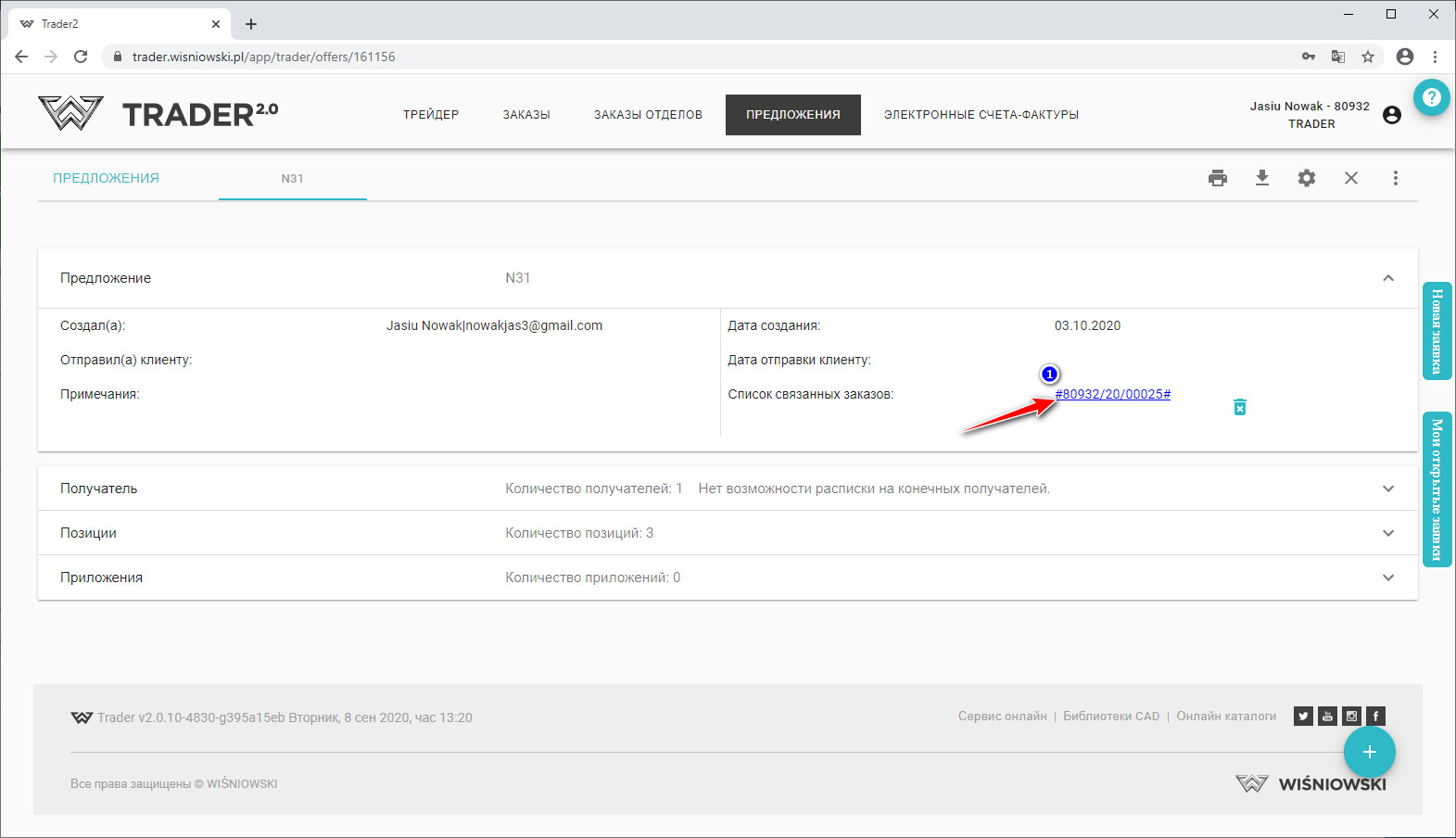 В подробностях предложения Вы увидите список связанных заказов, и, нажав на номерr (1) Вы автоматически попадете в созданный заказ. (Созданный заказ также можно найти на вкладке ЗАКАЗЫ в списке заказов).