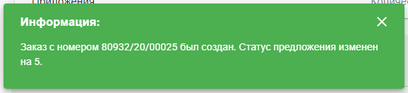 Если заказ будет создан правильно, появится сообщение с номером заказа.