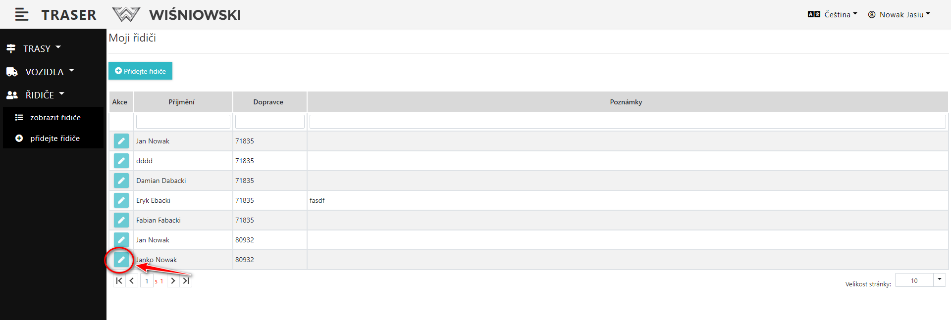 2. Klikněte na zelené tlačítko s ikonou tužky vedle příslušného Řidiče (Obr. 6.), pro otevření bočního panelu pro edice Řidiče.
