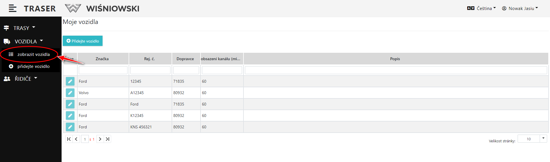 1. Vyberte v bočním Menu: Vozidla → zobrazit pojazdy. (Obr. 5.). Měl by být zobrazen seznam vozidel.