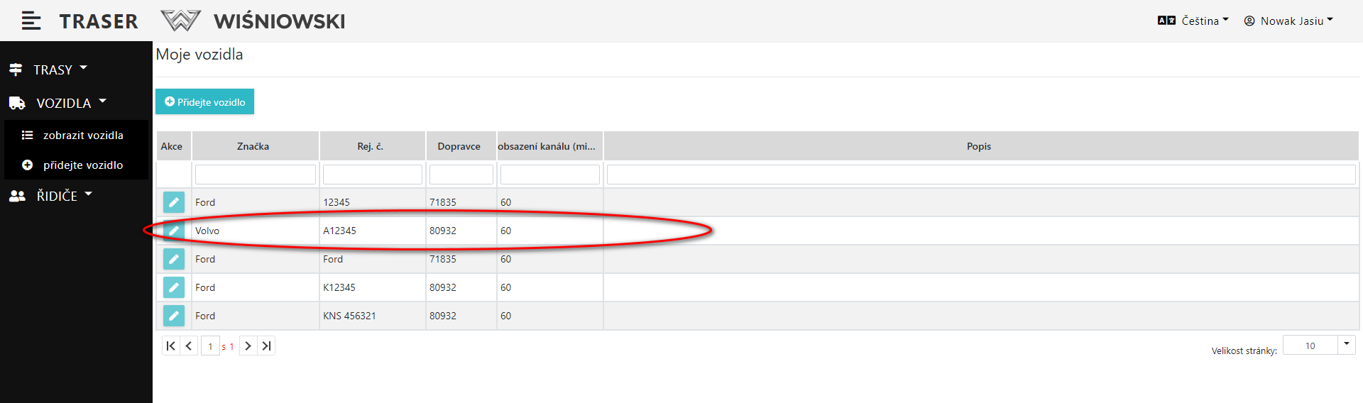 2. Klikněte na zelené tlačítko s ikonou tužky vedle příslušného Vozidla (Obr. 6.), pro otevření bočního panelu pro edice vozidla.