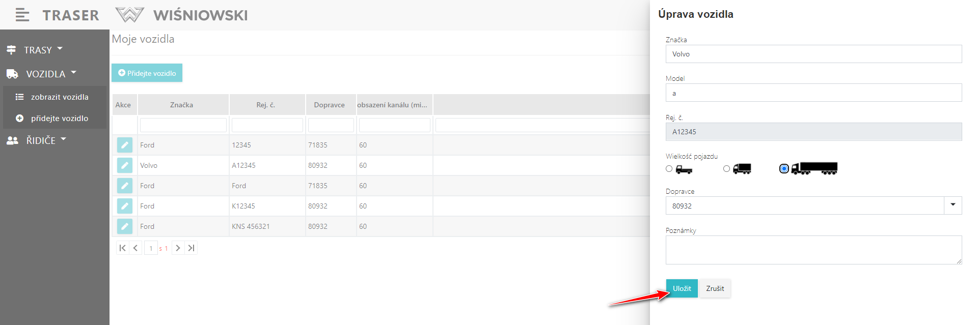 3. Upravte vozidlo na bočním panelu a klikněte na tlačítko „ULOŽIT“ (Obr. 7.). Registrační číslo vozidla nelze upravit.