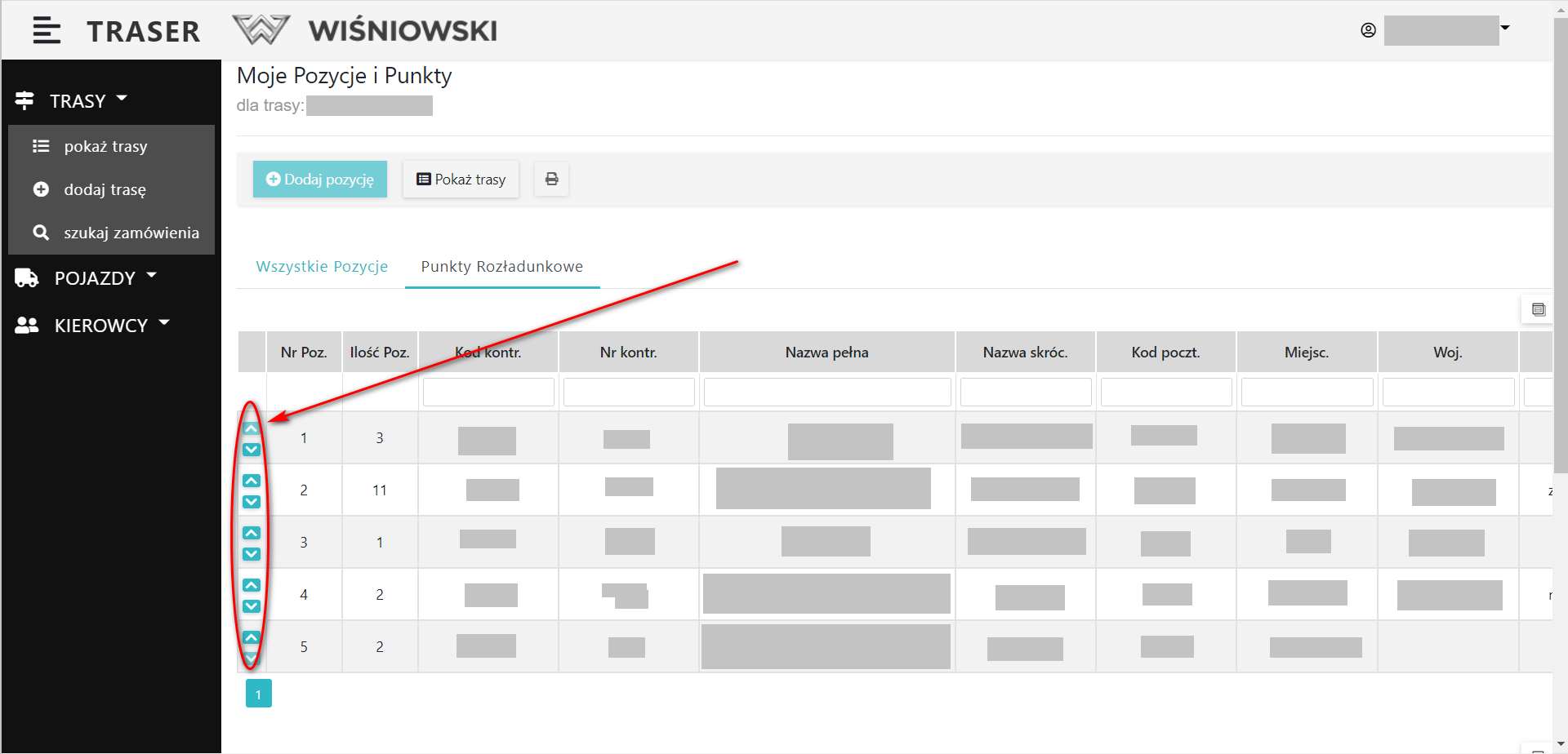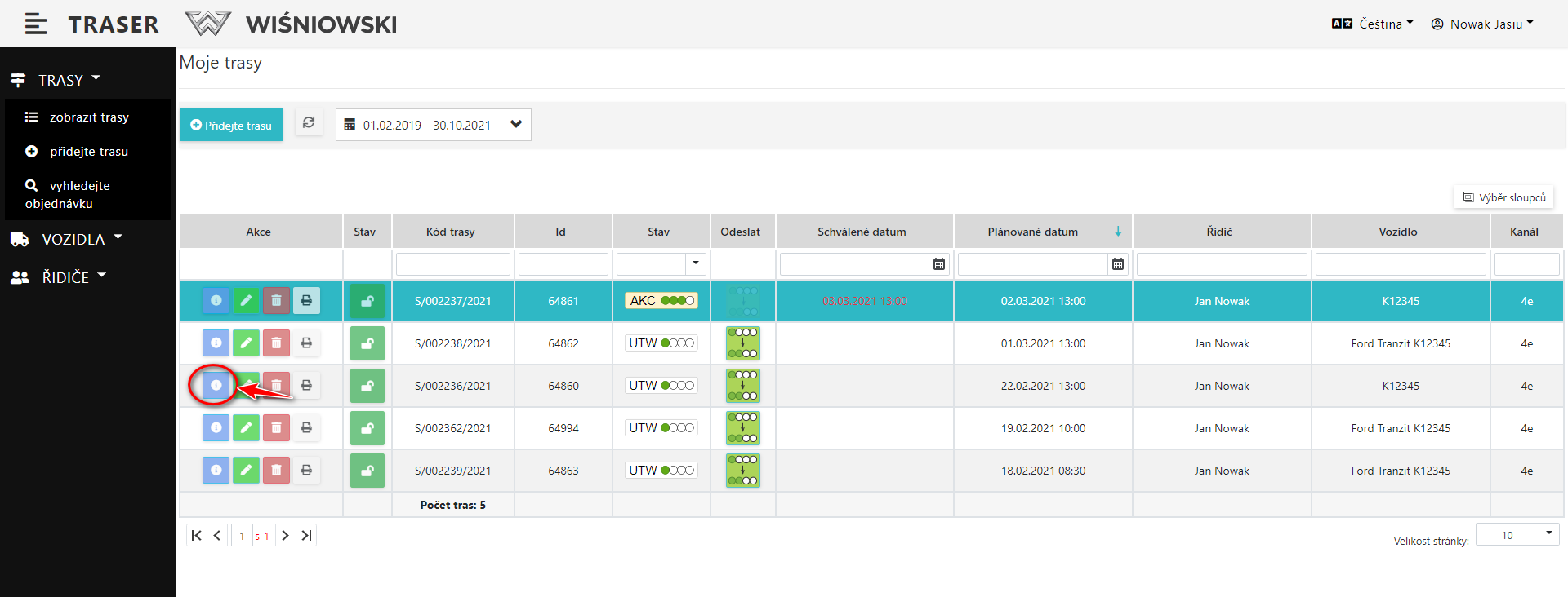 1. Vyberte v bočním Menu: Trasy → zobrazit trasy. Měl by se zobrazit seznam . Klikněte na modré tlačítko s informační ikonou vedle příslušné Trasy (Obr. 1.).