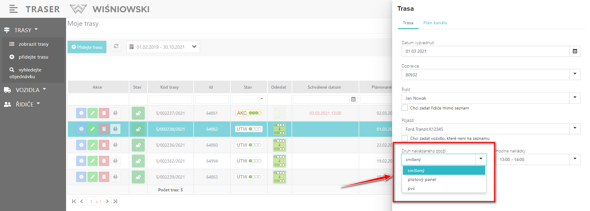 Při vytváření / editaci trasy (viz: CS02. Stanovení nové trasy) musíte zvolit, jaký druh zboží chcete vyzvednout (Obr.1.). K dispozici jsou následující typy:
