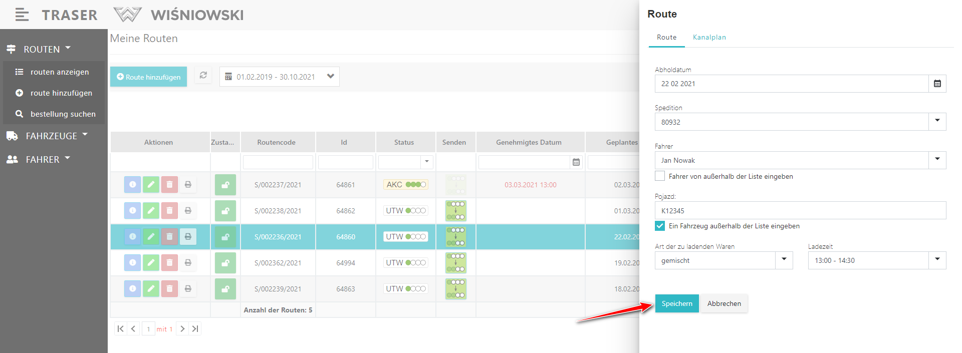 2. Bearbeiten Sie im Seitenpanel die Route und klicken Sie auf "Speichern" (Abb. 2.).