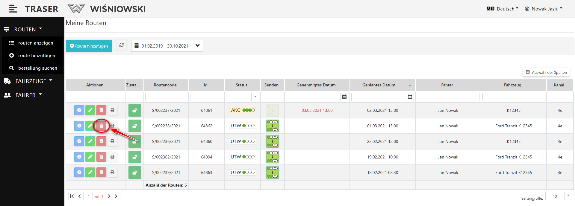 1. Um eine Route zu löschen, klicken Sie auf die rote Schaltfläche mit dem Mülleimersymbol neben der entsprechenden Route (Abb. 3), und bestätigen Sie dann das Löschen durch Klicken auf "löschen".