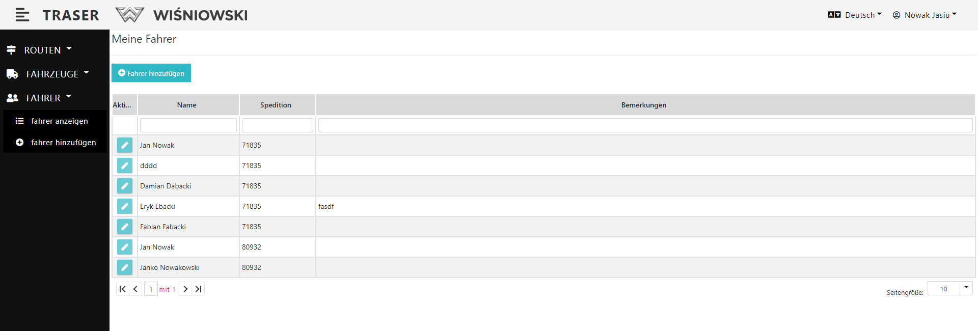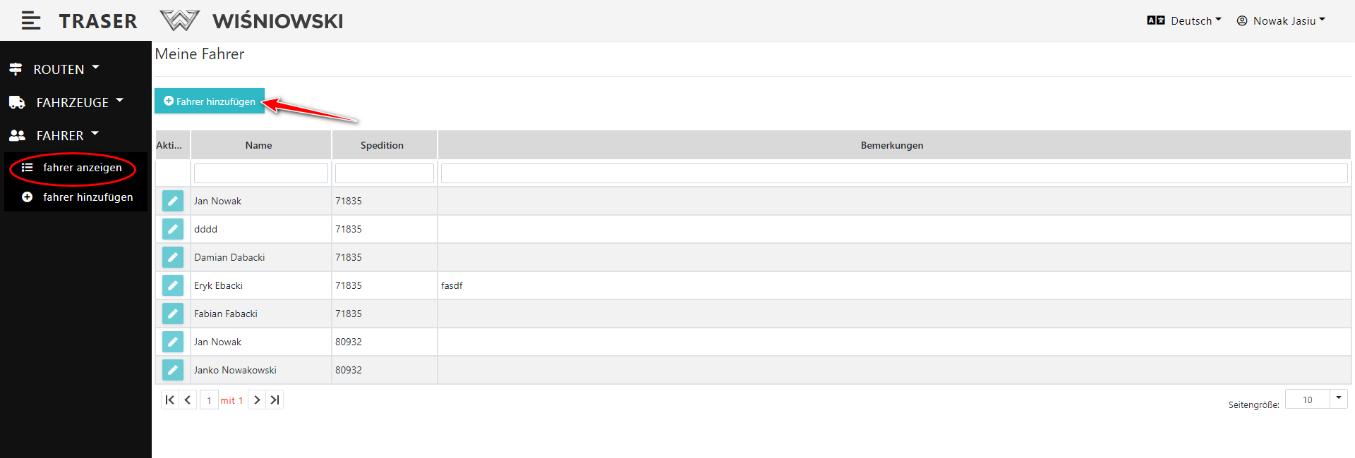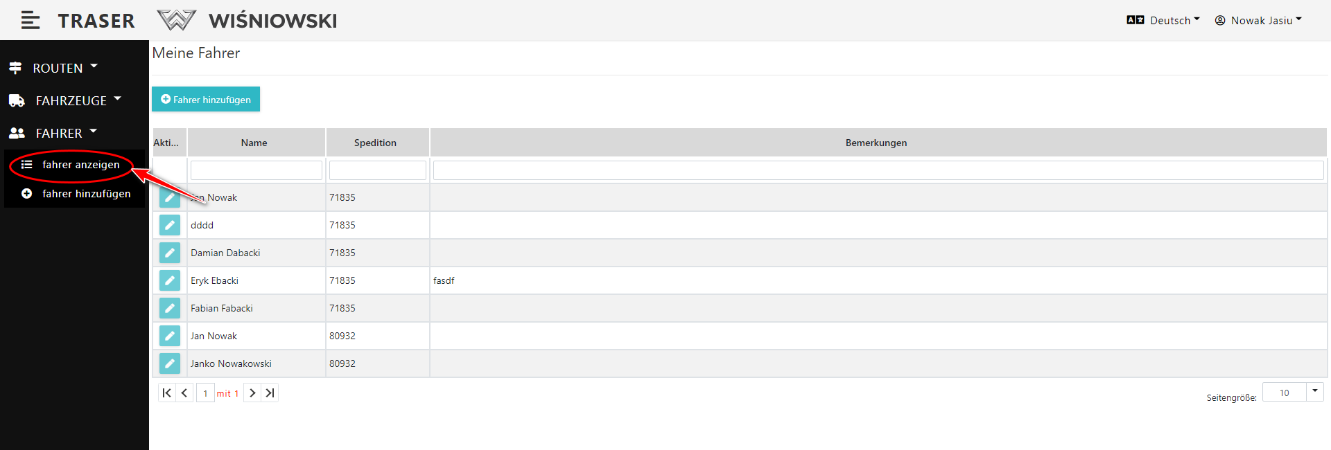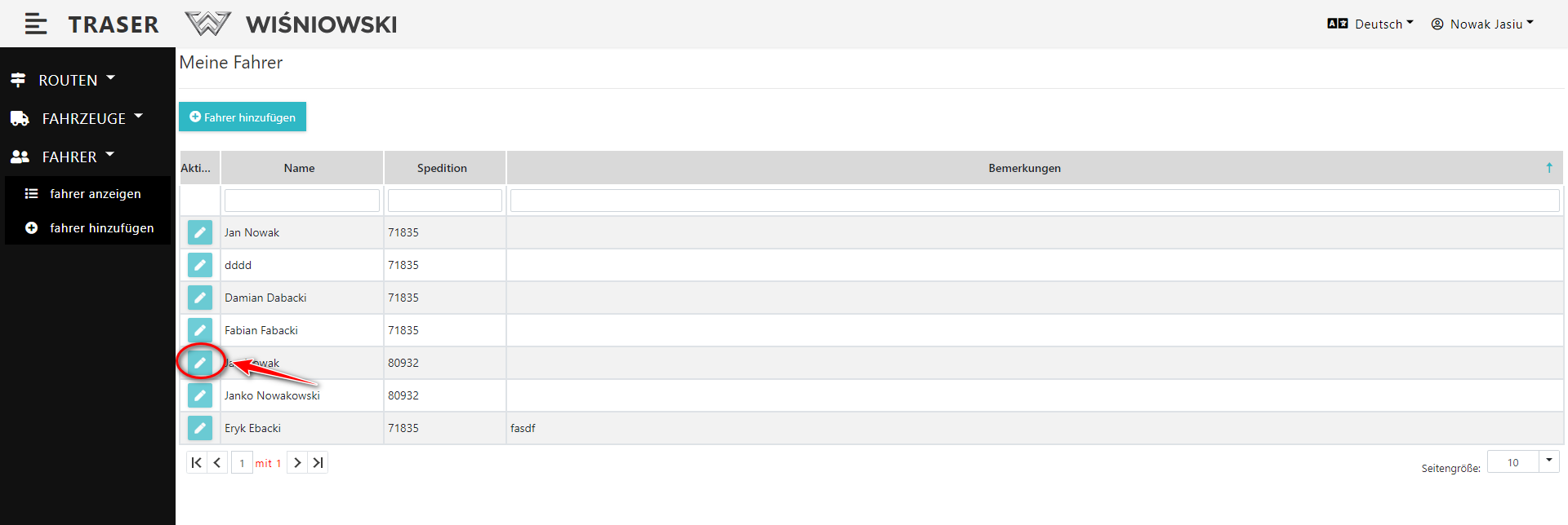 2. Klicken Sie auf die grüne Schaltfläche mit dem Stiftsymbol neben dem entsprechenden Fahrer (Abb. 6.), um das Seitenpanel zum Bearbeiten des Fahrers zu öffnen.