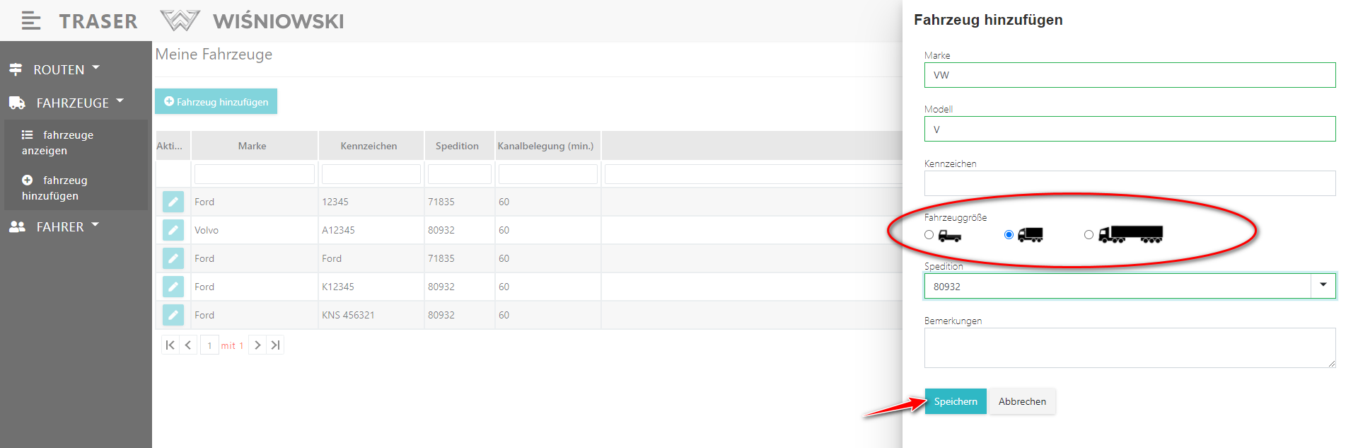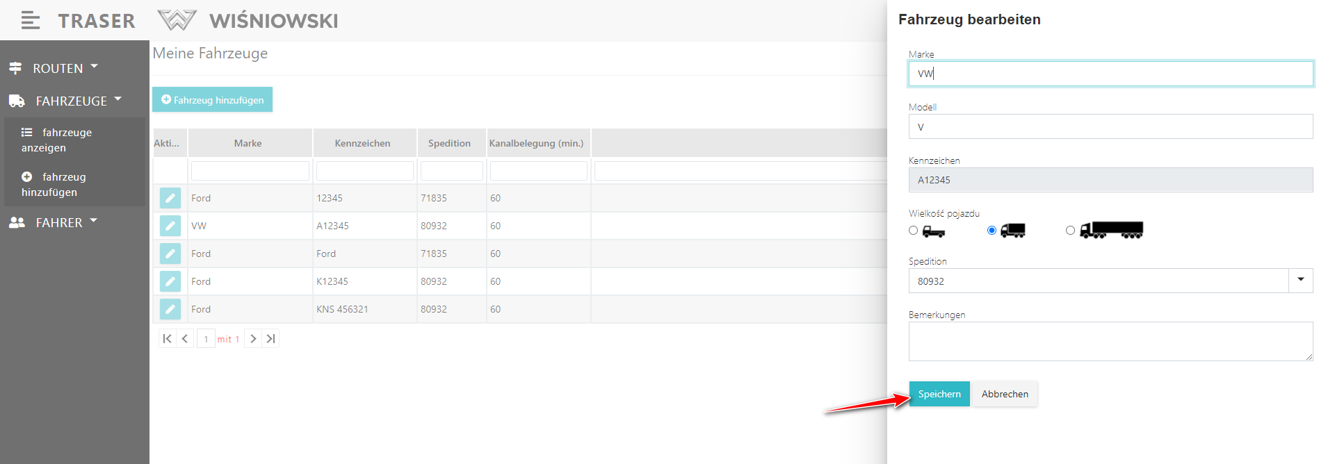 3. Bearbeiten Sie das Fahrzeug auf dem Seitenpanel und klicken Sie auf die Schaltfläche "Speichern". (Abb. 7.). Kennzeichen des Fahrzeugs kann nicht bearbeitet werden.