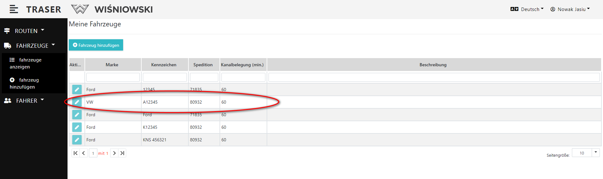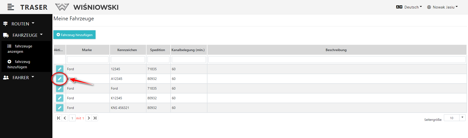 2. Klicken Sie auf die grüne Schaltfläche mit dem Stiftsymbol neben dem entsprechenden Fahrzeug (Abb. 6.), um ein Seitenpanel zum Bearbeiten des Fahrzeugs zu öffnen.
