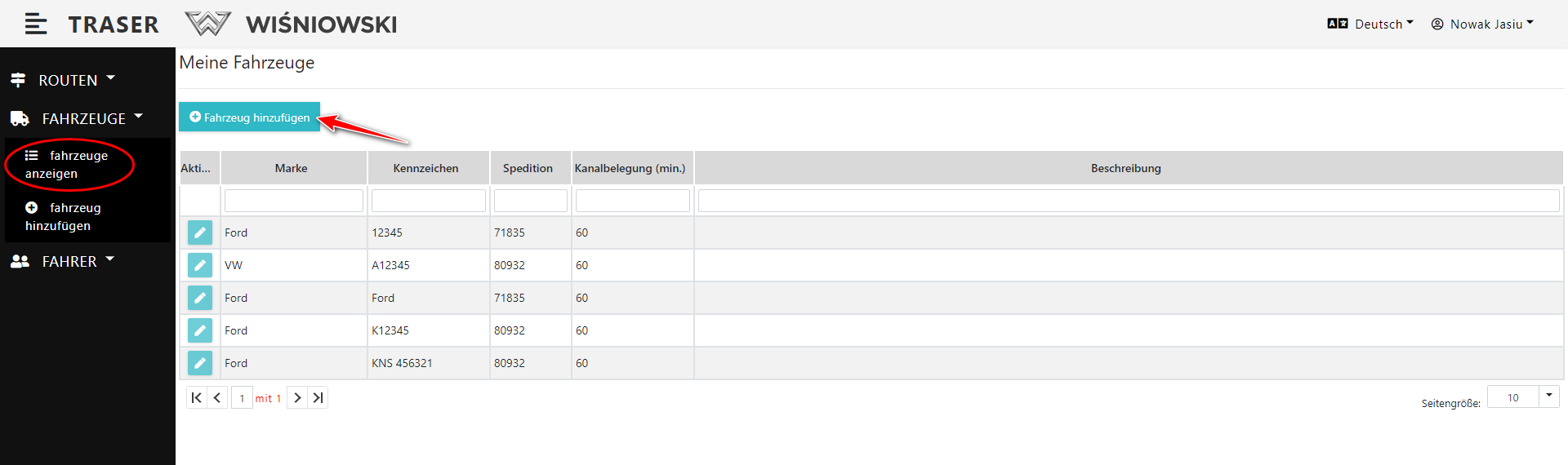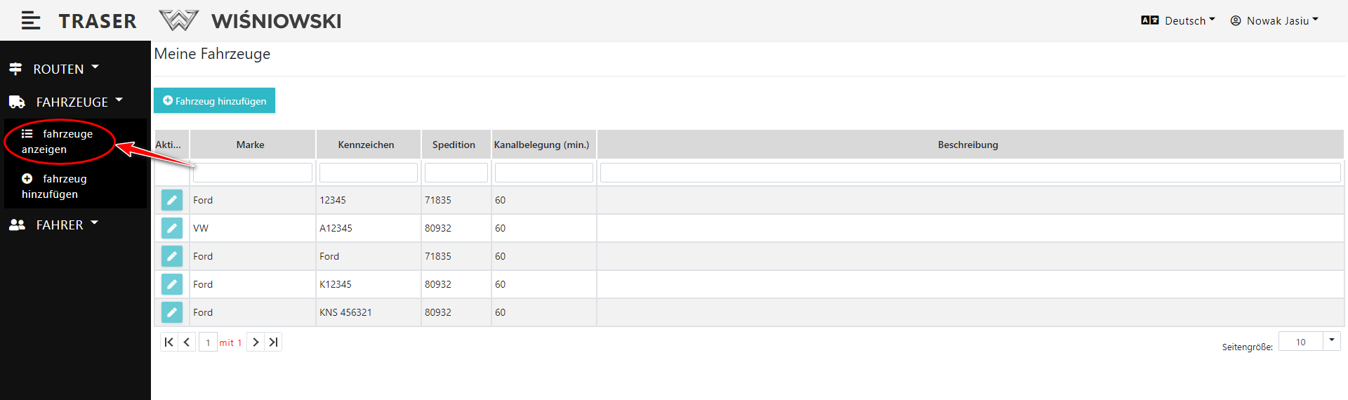 1. Wählen Sie im Seitenmenü: FAHRZEUGE→ Fahrzeuge anzeigen. Es sollte eine Liste der Fahrzeuge erscheinen.