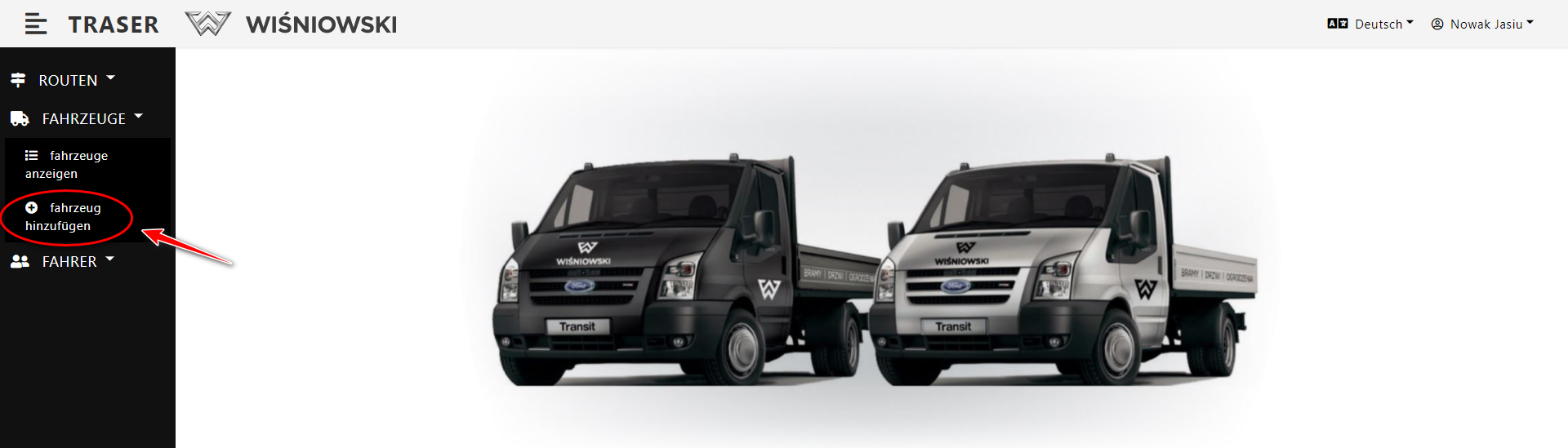 Abb. 1. Hinzufügen eines Fahrzeugs über das Seitenmenü.