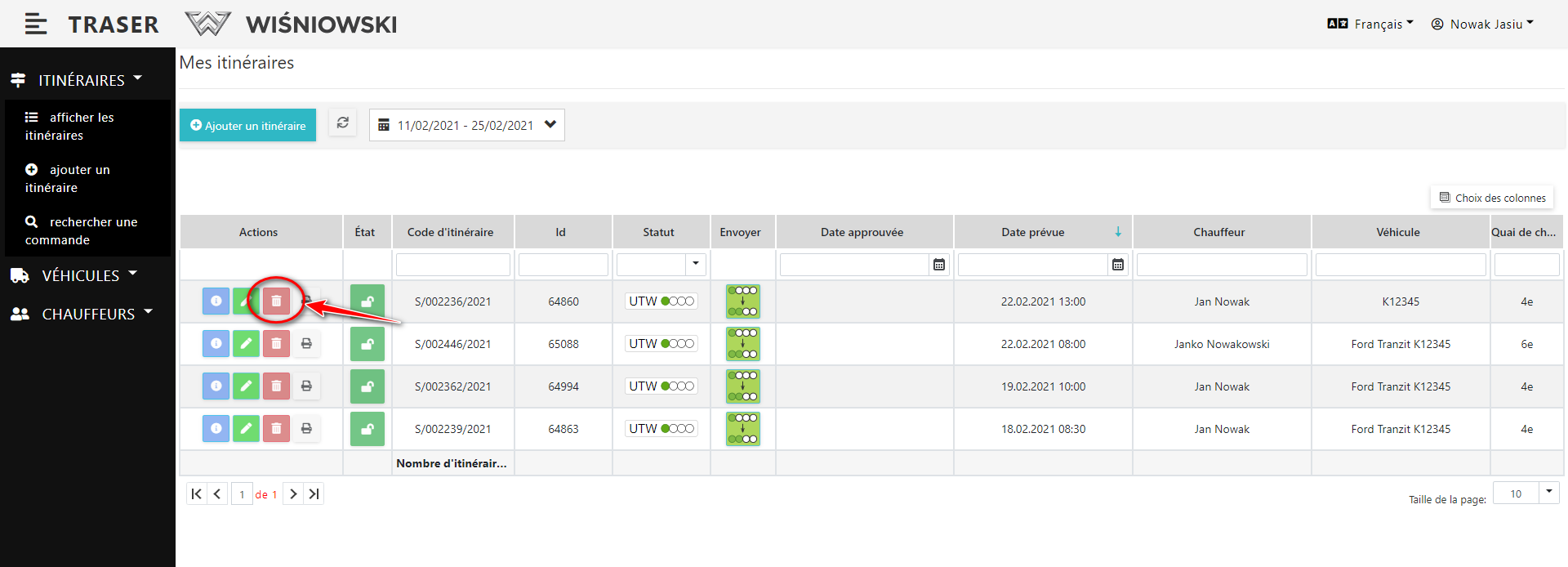 1. Pour supprimer un itinéraire, cliquez sur le bouton rouge avec l'icône d'une poubelle, à côté de l'itinéraire approprié (Fig. 3) et confirmez la suppression en cliquant sur le bouton "SUPPRIMER".